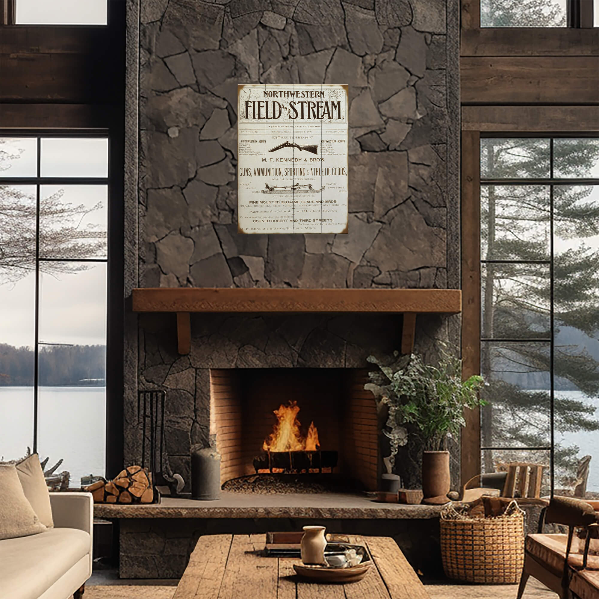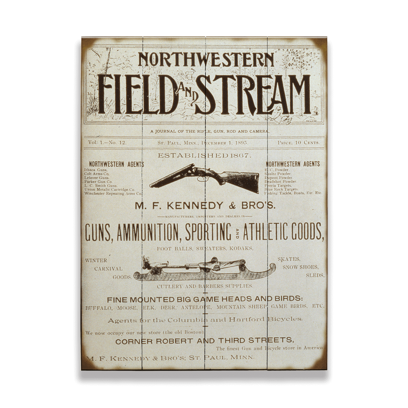 Step back into the roots of American sporting culture with this classic Field and Stream cover from December 1895. Styled like a vintage advertisement, it showcases the era’s premier outfitter offering everything from firearms and fishing tackle to mounted game heads and winter gear. With its elegant typography and early branding design, this historic piece captures a time when outdoor adventure, craftsmanship, and commerce came together under one roof. A compelling addition to any space that honors the heritage of hunting, fishing, and frontier life.