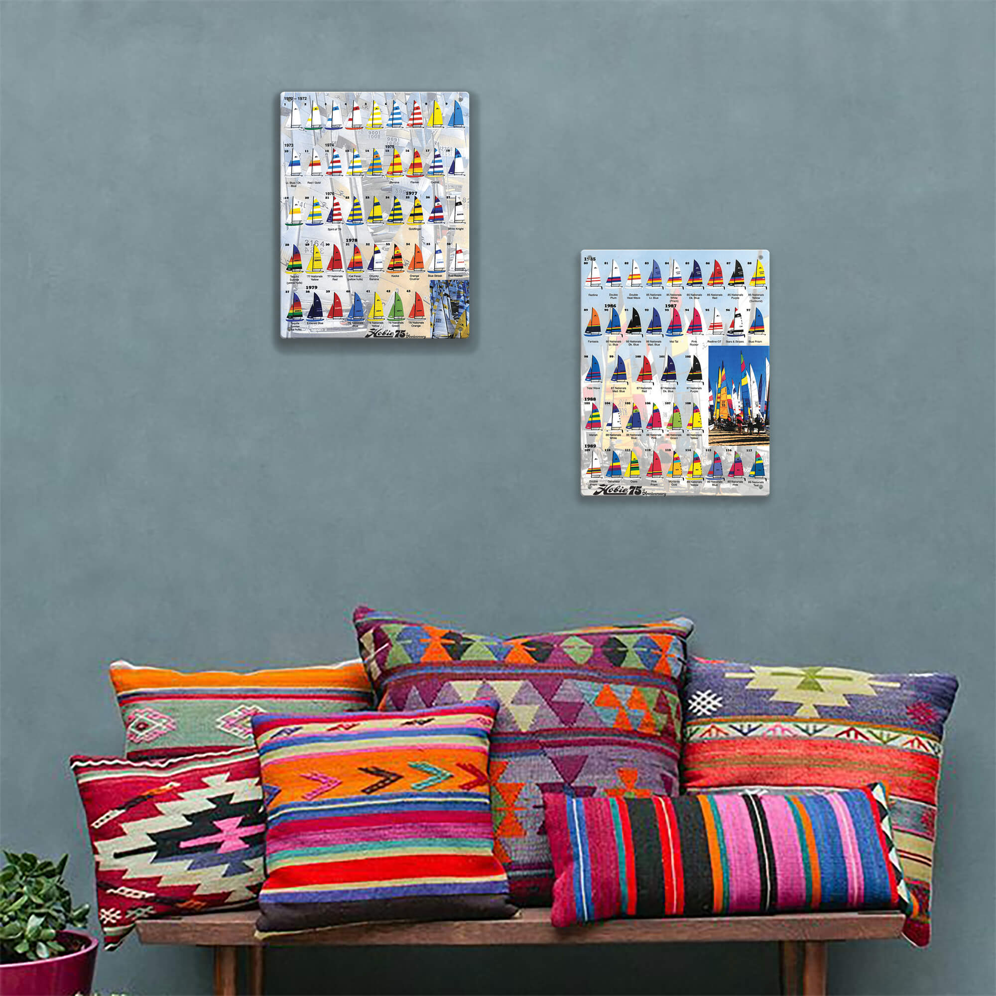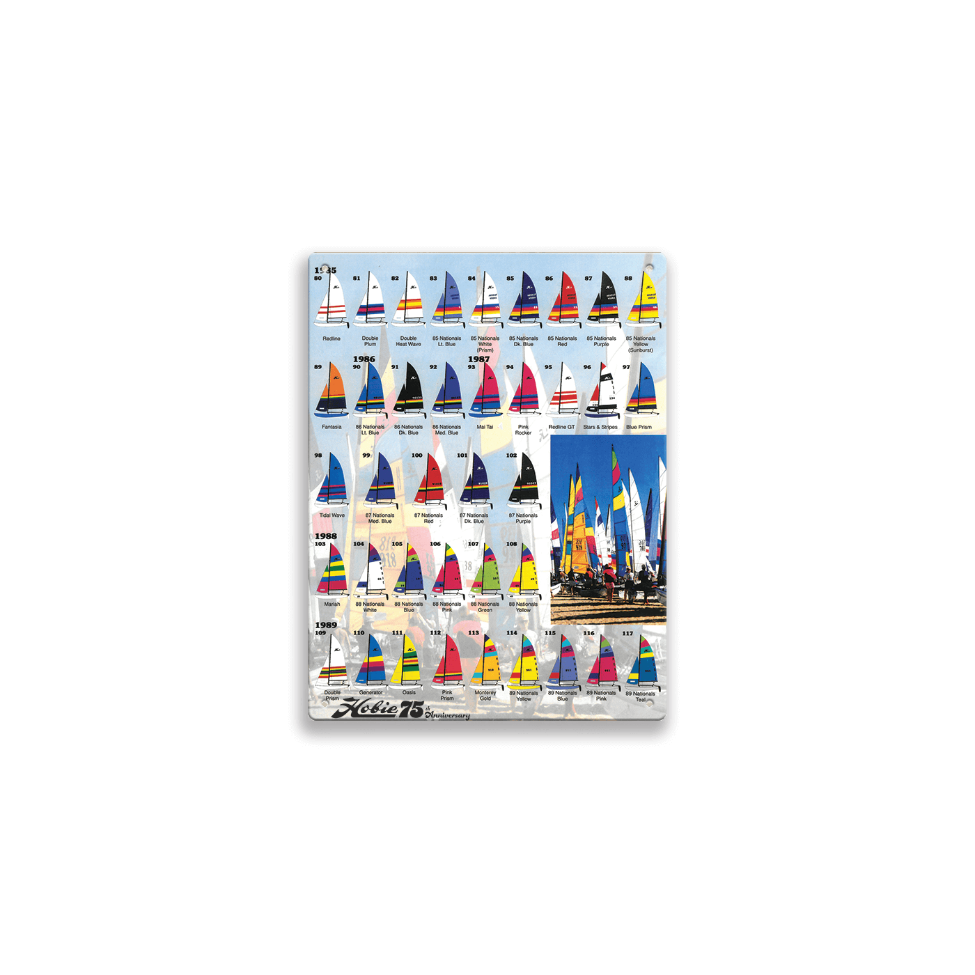 This vibrant visual archive highlights the evolution of Hobie sail designs through the late 1980s, showcasing an array of bold colors and iconic patterns. Each sail represents a specific model and year, tracing the innovation, creativity, and unmistakable energy that have defined Hobie catamarans for generations. A perfect piece for enthusiasts and collectors, this special edition chart celebrates 75 years of Hobie’s legacy with a colorful tribute to design history on the water.