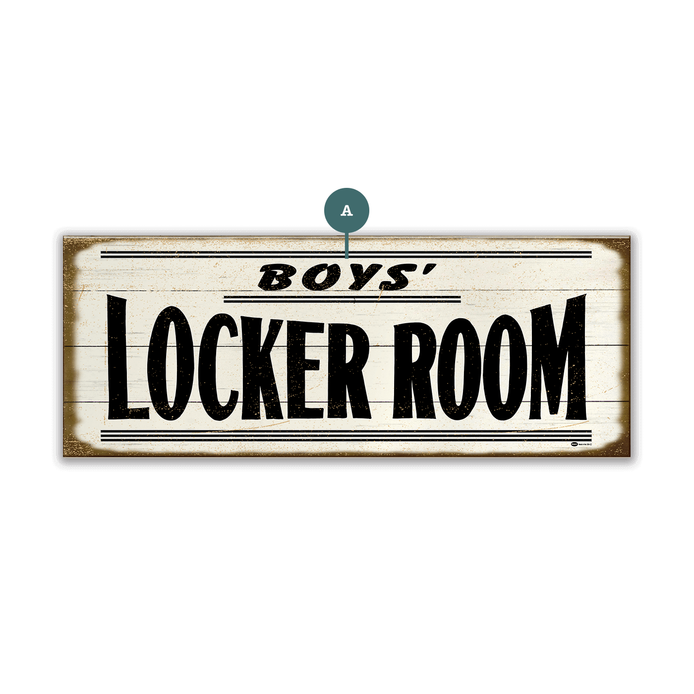 Set the scene for sport and camaraderie with this classic "Locker Room" sign. Featuring bold, black lettering on a vintage, distressed background, this piece adds a touch of nostalgic athleticism to any space. Ideal for schools, sports facilities, or as a unique decorative touch in a home gym, this customizable sign can be adapted to fit any setting or name, making it a versatile addition to your decor.