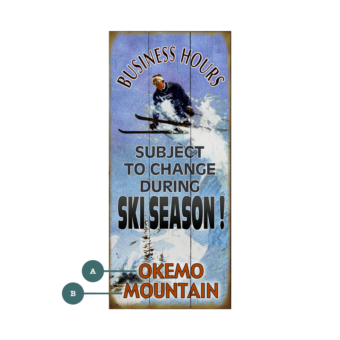 This artwork playfully reminds us of the ever-changing pace during the ski season. Featuring an action-packed image of a skier in mid-descent, this piece captures the spirit and energy of winter sports while humorously addressing the reality of seasonal business hours. It's a perfect addition to any business that adjusts its operations around the ski season or for anyone who appreciates the wintery blend of work and play.