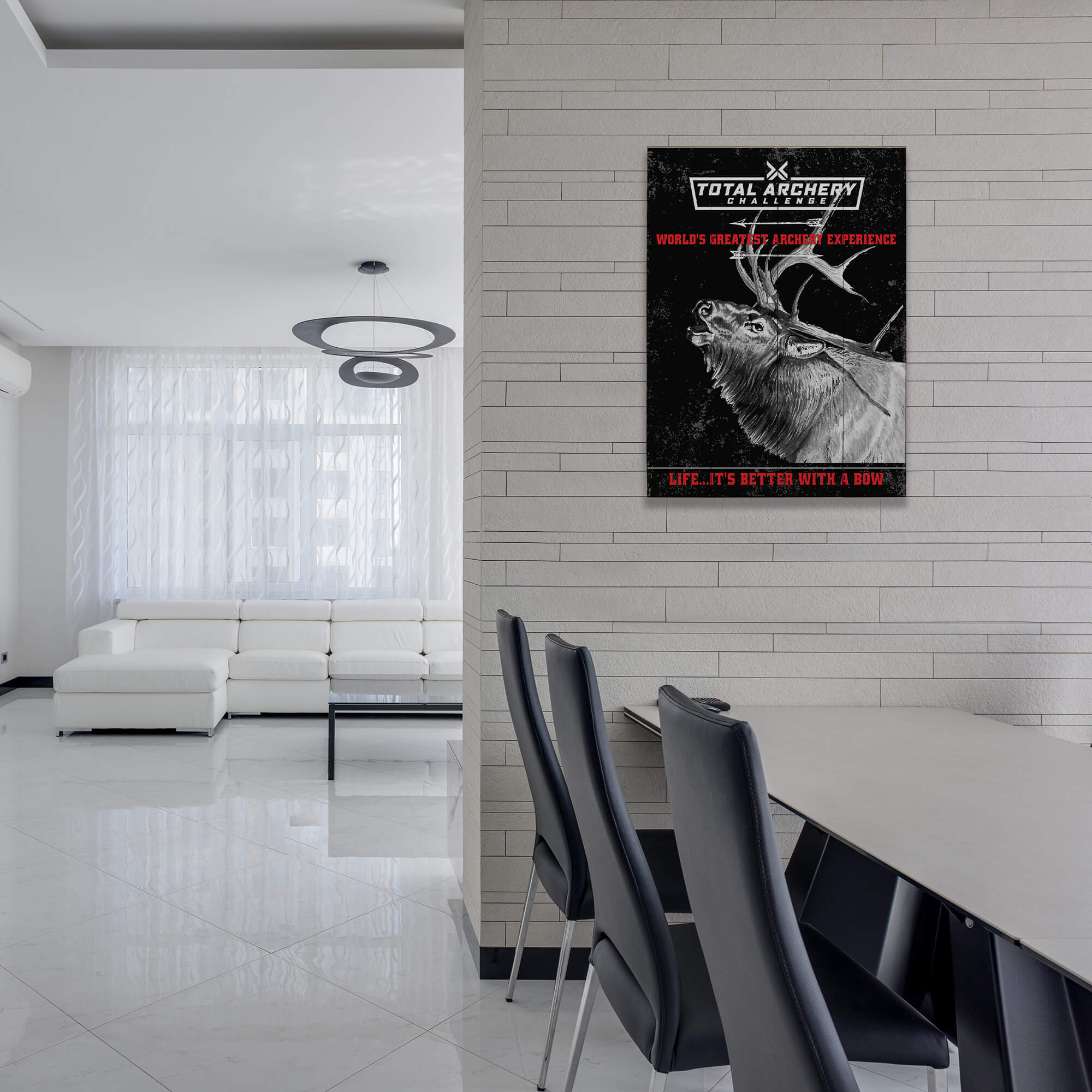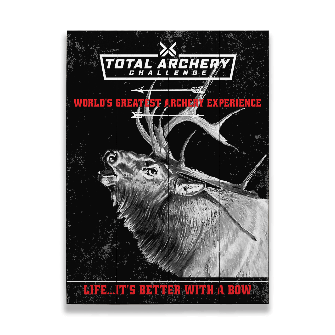 Celebrate the thrill of the hunt and the passion for precision with this bold artwork featuring the Total Archery Challenge logo and a striking illustration of a bugling elk. Set against a rugged black background with distressed textures and sharp red lettering, it captures the energy and excitement of the world’s greatest archery experience. A perfect addition for bowhunters, archery enthusiasts, or anyone who knows—life really is better with a bow.