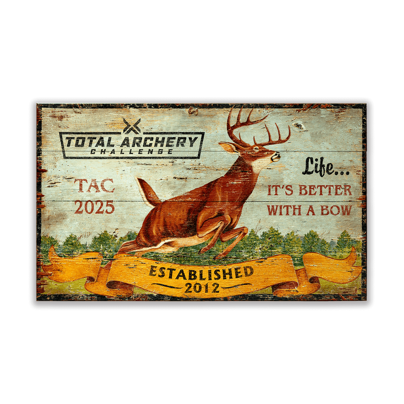 Mark the legacy of bowhunting with this bold, vintage-inspired artwork honoring the Total Archery Challenge. Featuring a dynamic whitetail buck in mid-leap, bold 2025 event text, and the iconic “Life... It’s Better With a Bow” message, it captures the adrenaline and heritage of the archery community. The distressed finish and classic design make it a standout piece for hunters, archers, and outdoor enthusiasts alike. A perfect addition to man caves, cabins, or gear rooms.