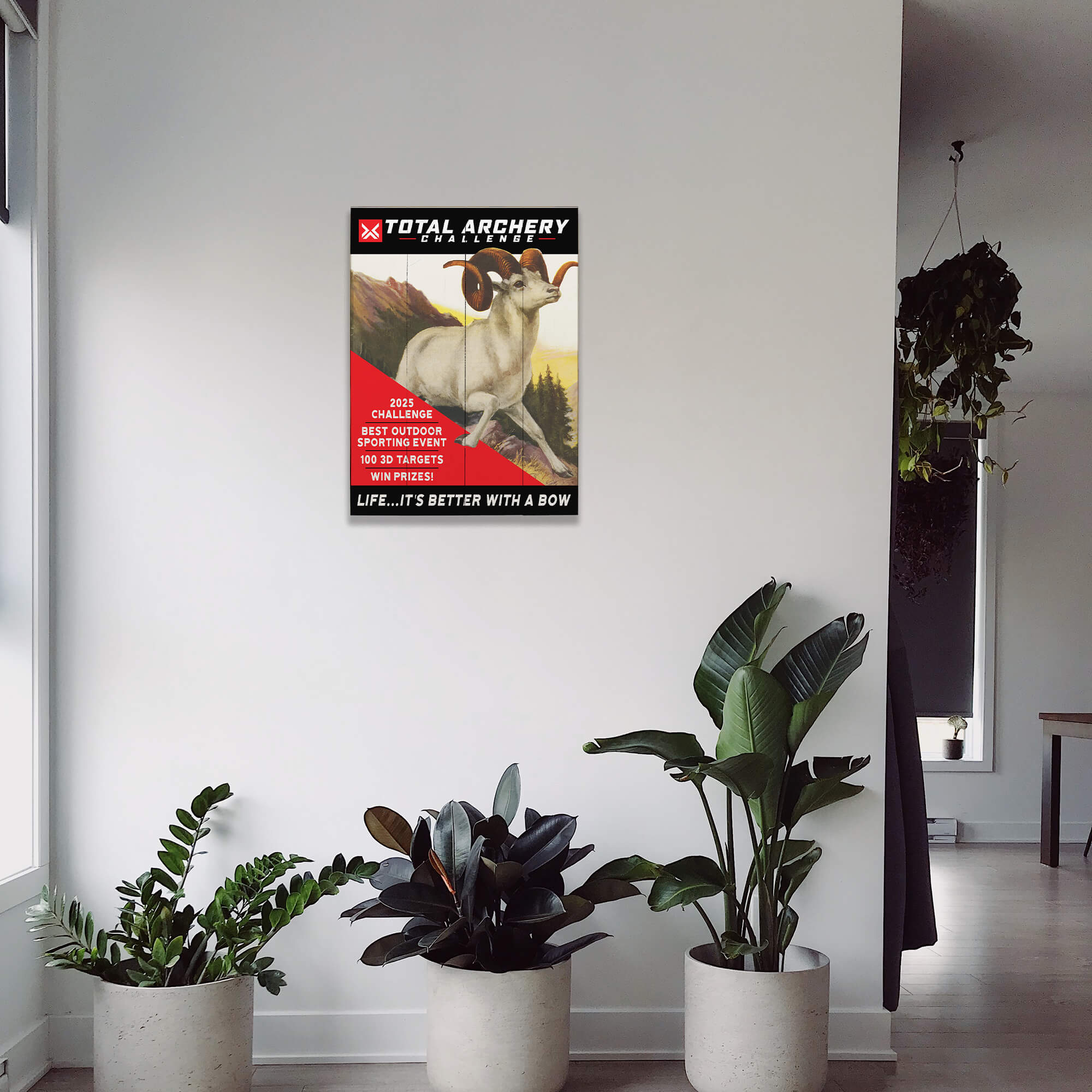 Celebrate the thrill of the challenge with this bold and energetic tribute to the 2025 Total Archery Challenge. Featuring a charging bighorn ram against a rugged mountain backdrop, this piece captures the heart-pounding energy of a world-class outdoor sporting event. With over 100 3D targets, this prize-winning competition is a reminder that life is always better with a bow. A perfect addition to cabins, ranges, or any space that honors the wild spirit of the hunt.
