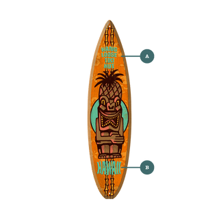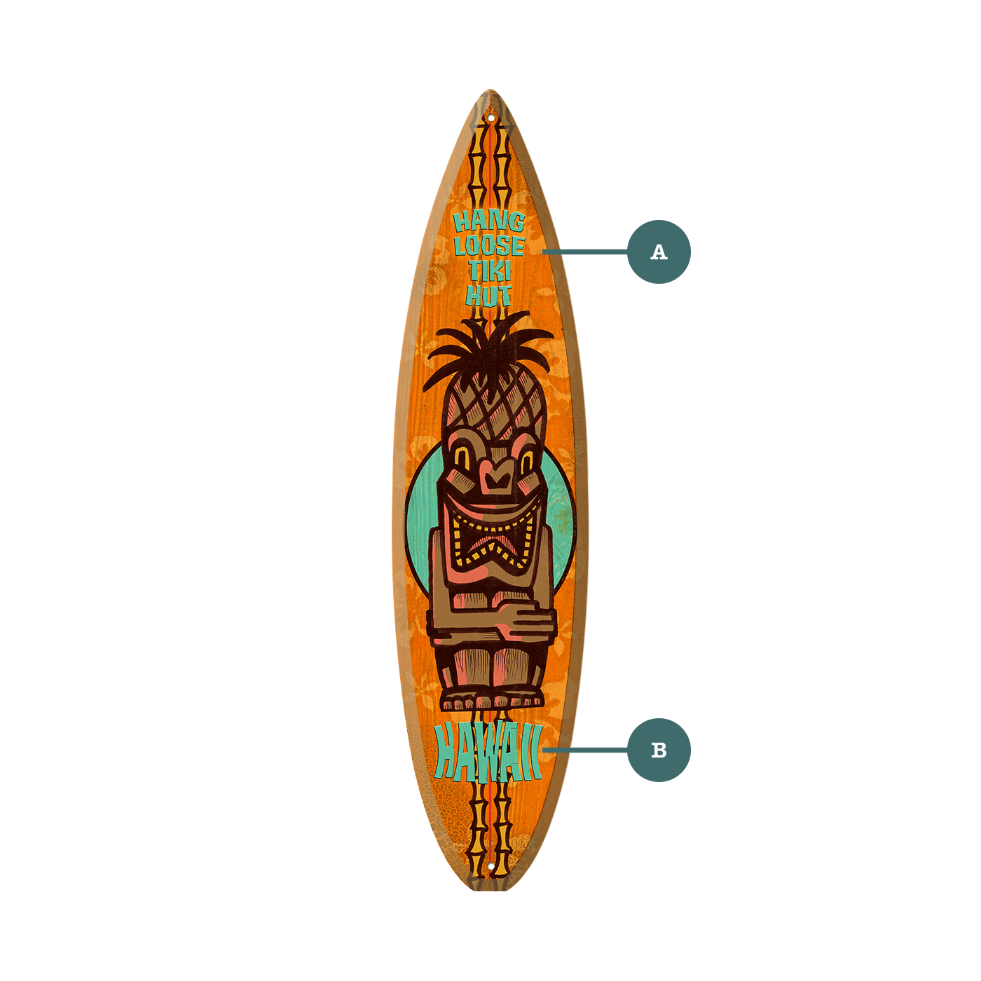 Embrace the spirit of Aloha with this vibrant Tiki Hut themed surfboard sign. The design features a charismatic Tiki figure set against an orange backdrop, encapsulating the tropical vibes of Hawaii. Customize the sign to make it your own!