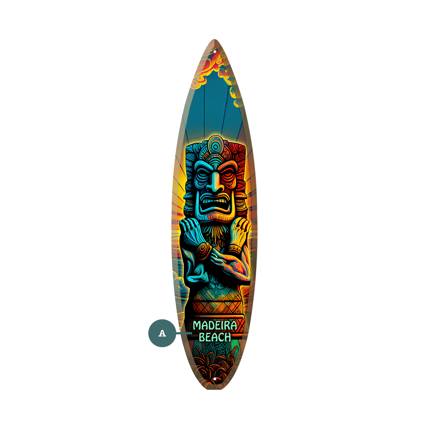 Featuring a bold tiki figure glowing against a fiery sunset sky, Tiki Man 1 is part of our Tiki Man Surfboard Wall Art Collection. Each design blends Polynesian-inspired style with the vibrant spirit of surf culture, creating a striking statement piece for any space. Perfect for beach houses, tiki bars, patios, or coastal décor, these surfboards add island personality and can be customized with your favorite location.
