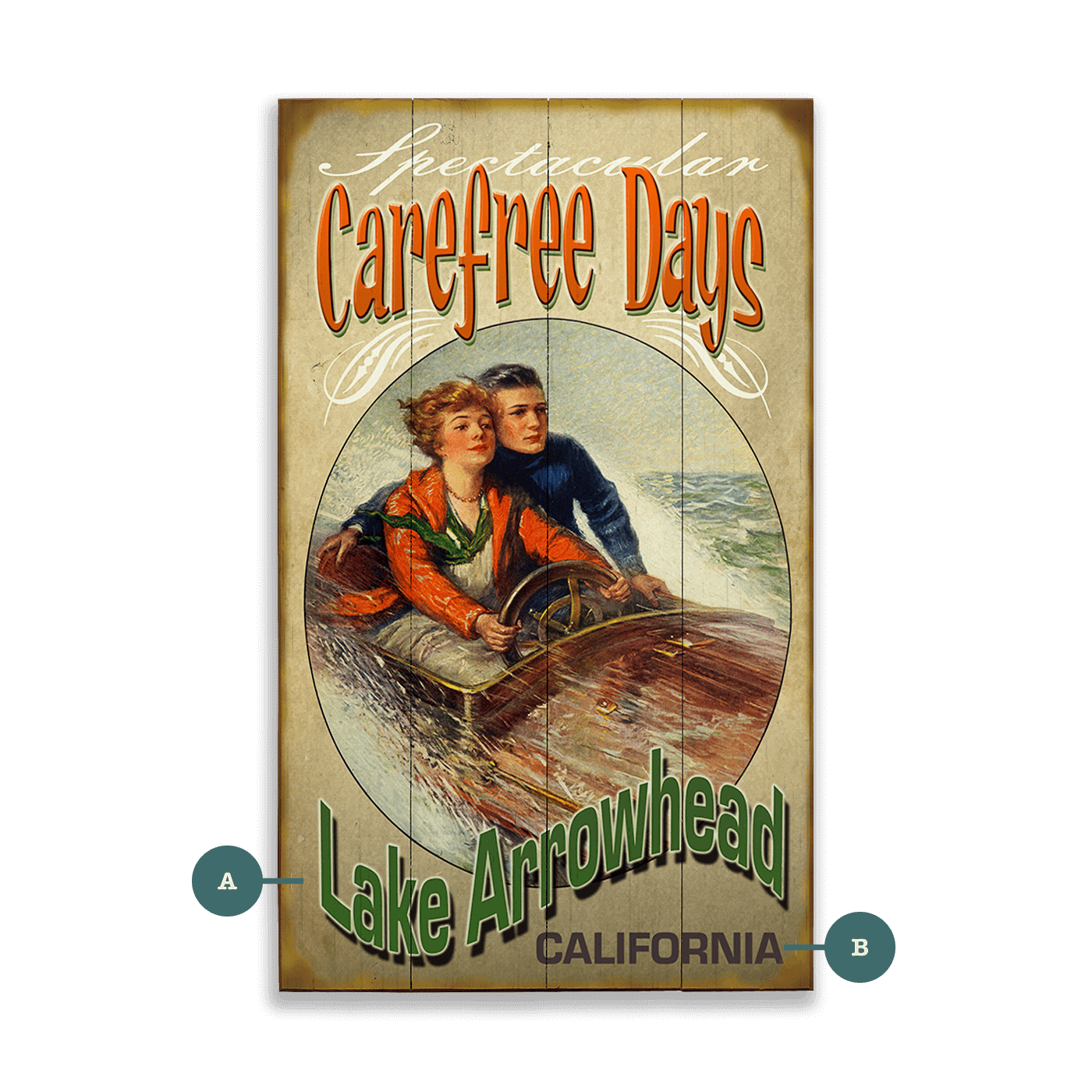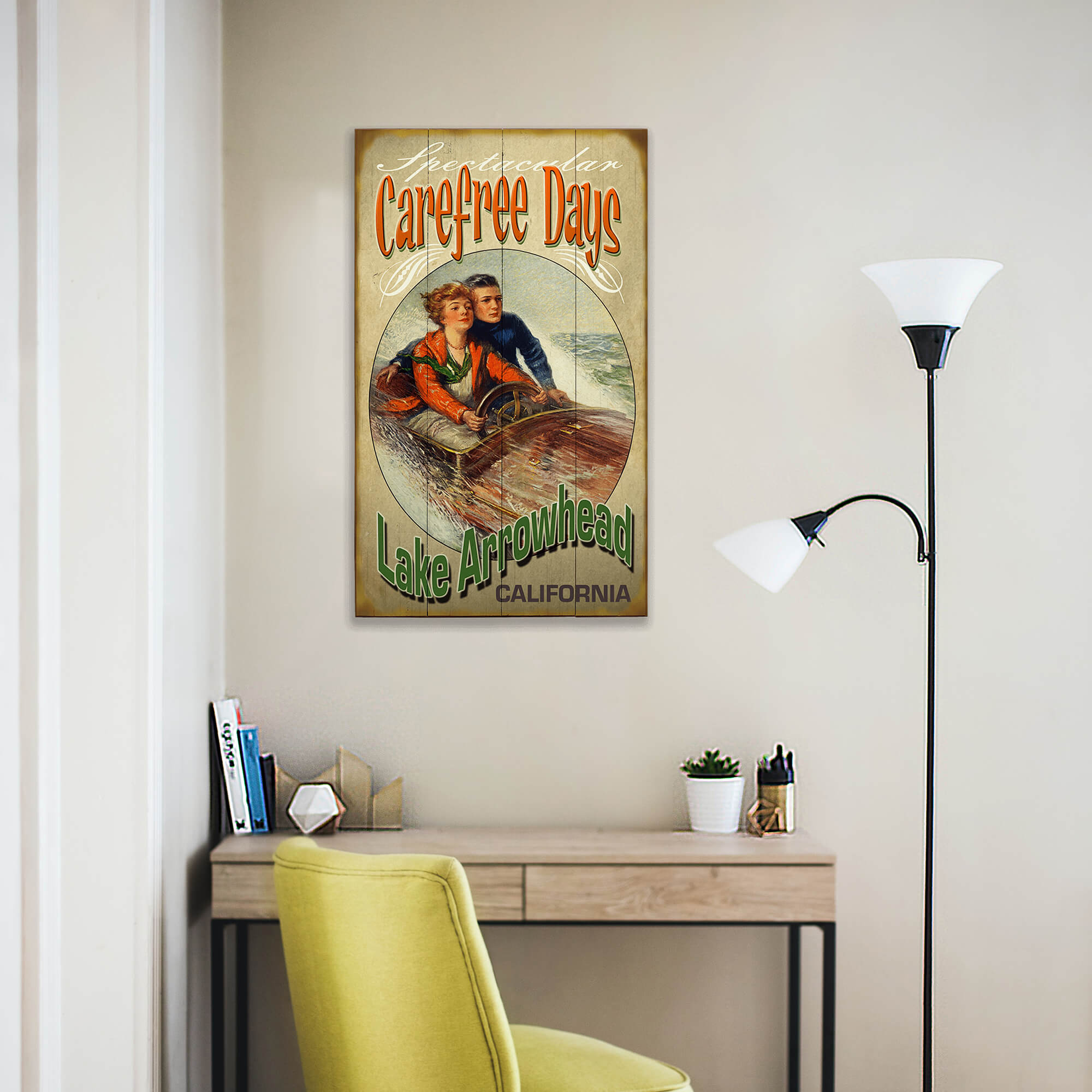 Capture the essence of 'Carefree Days' with our enchanting vintage-inspired wood sign! This delightful artwork features a couple enjoying a spirited boat ride, effortlessly conveying a sense of freedom and adventure. The intricate details and vibrant colors bring the scene to life, making it a perfect addition to any room that celebrates the joy and romance of carefree moments.