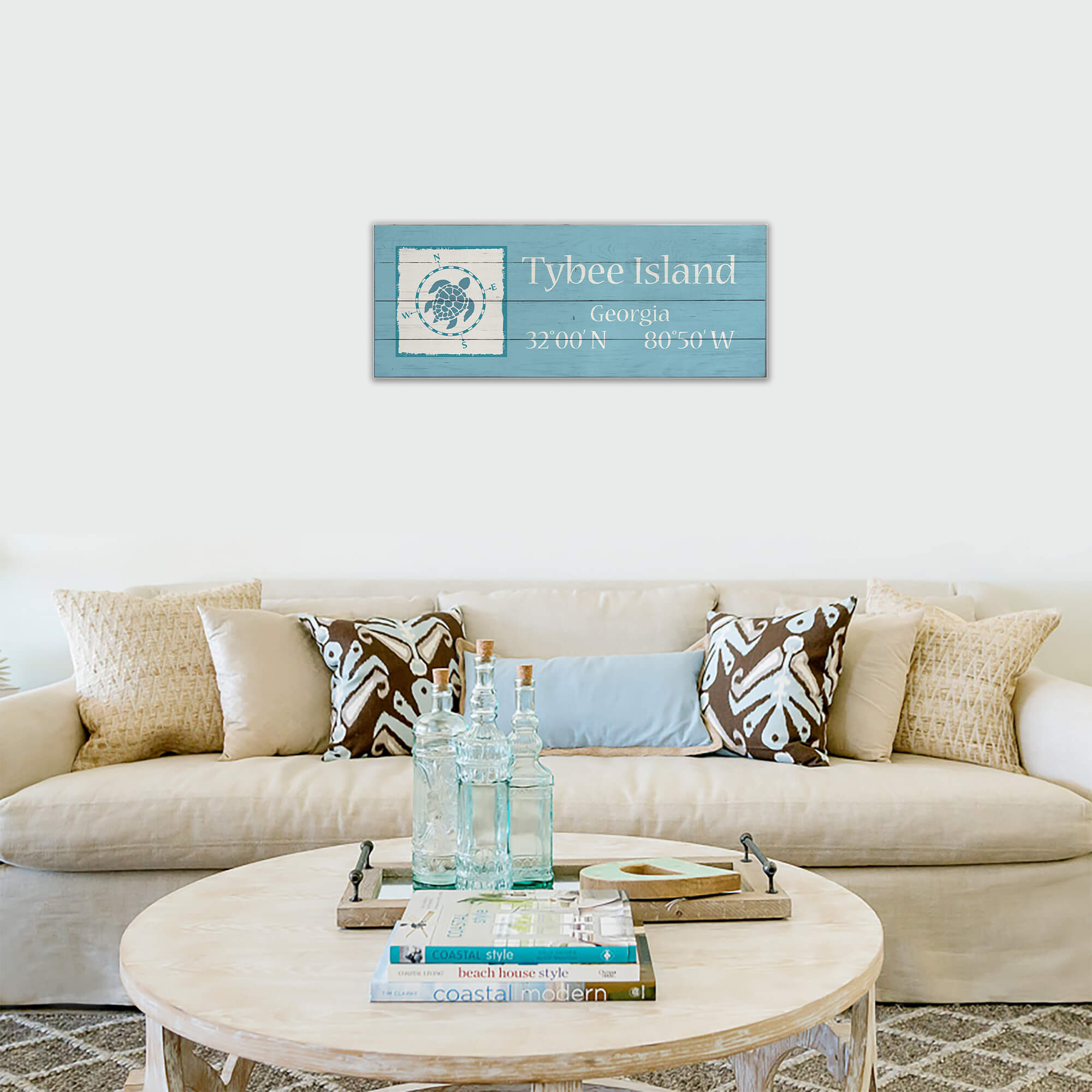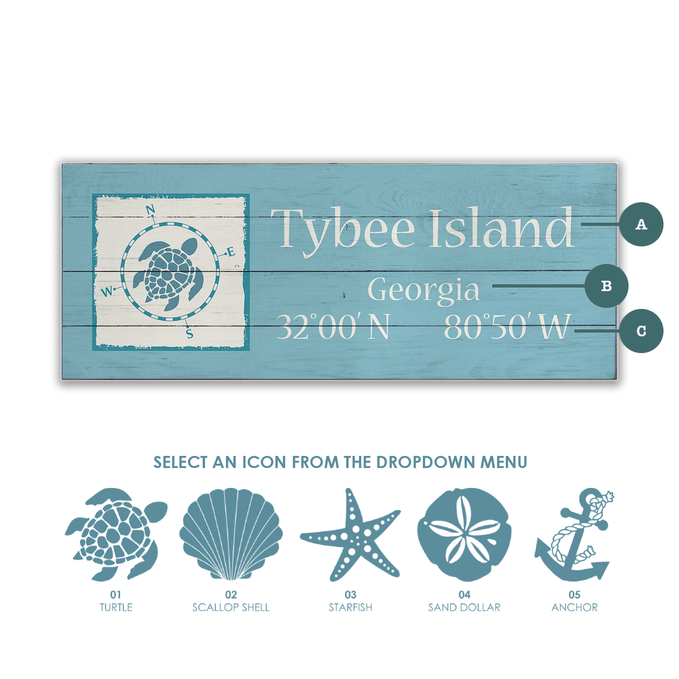 Bring coastal elegance to any space with this customizable sign featuring classic compass-inspired art and space for your chosen location and coordinates. With five icon options to match your personal style, it evokes a timeless maritime feel perfect for beach homes, lake cabins, or nautical-themed rooms. Its refined design makes it an inviting way to showcase your favorite getaway or celebrate your love of life by the water.