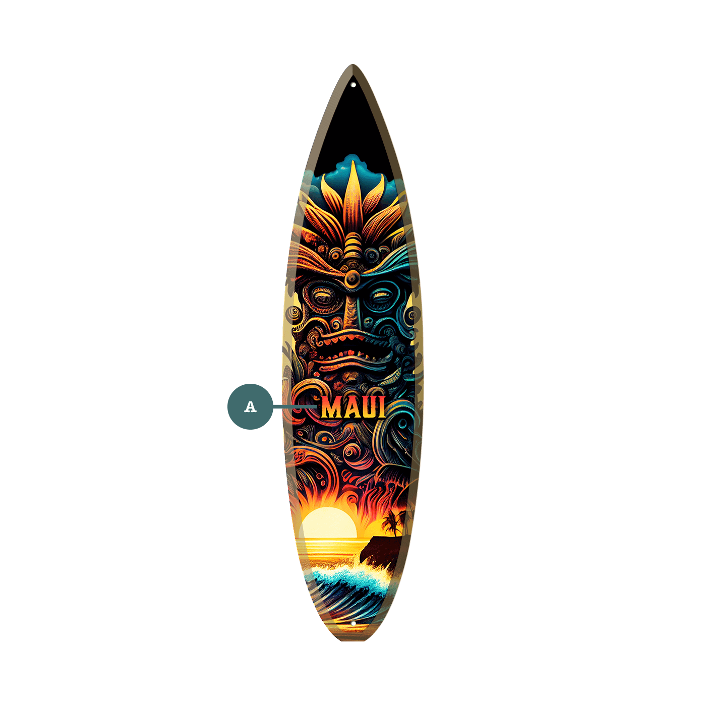 Showcasing an intricate tiki design rising above rolling surf and crashing waves, Tiki Man 2 is part of our Tiki Man Surfboard Wall Art Collection. Each design blends Polynesian-inspired style with the vibrant spirit of surf culture, creating a striking statement piece for any space. Perfect for beach houses, tiki bars, patios, or coastal décor, these surfboards add island personality and can be customized with your favorite location.