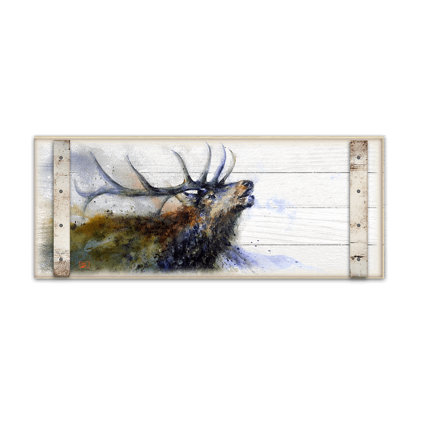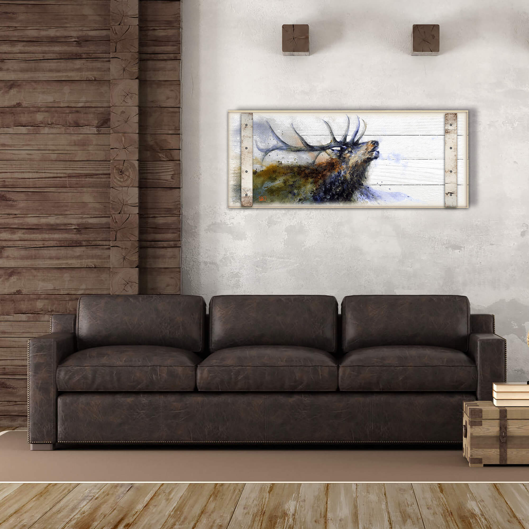 In a misty valley, an imposing elk raises its head and lets out a haunting call, the sound echoing through the stillness. This moment of raw power and wildness is captured in a stunning watercolor painting that expertly conveys the elk's majesty and presence. The artist has used bold brushstrokes and rich colors to create a sense of the elk's strength and energy, as it stands tall and proud in its element.