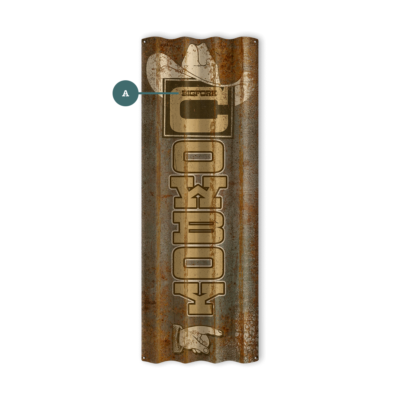This rustic metal sign captures the rugged spirit of the West with its bold, vertically stacked lettering and striking cowboy-themed imagery. Designed on corrugated metal, the weathered patina and rusted textures give it an authentic aged look, reminiscent of old barn walls and frontier signage. The composition is simple yet impactful, featuring a classic cowboy hat at the top and a pointing hand at the bottom, reinforcing a vintage Americana aesthetic. The distressed detailing enhances its nostalgic charm, making it a perfect statement piece for western-themed spaces, barns, saloons, or anyone looking to bring a bit of cowboy culture into their decor.