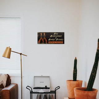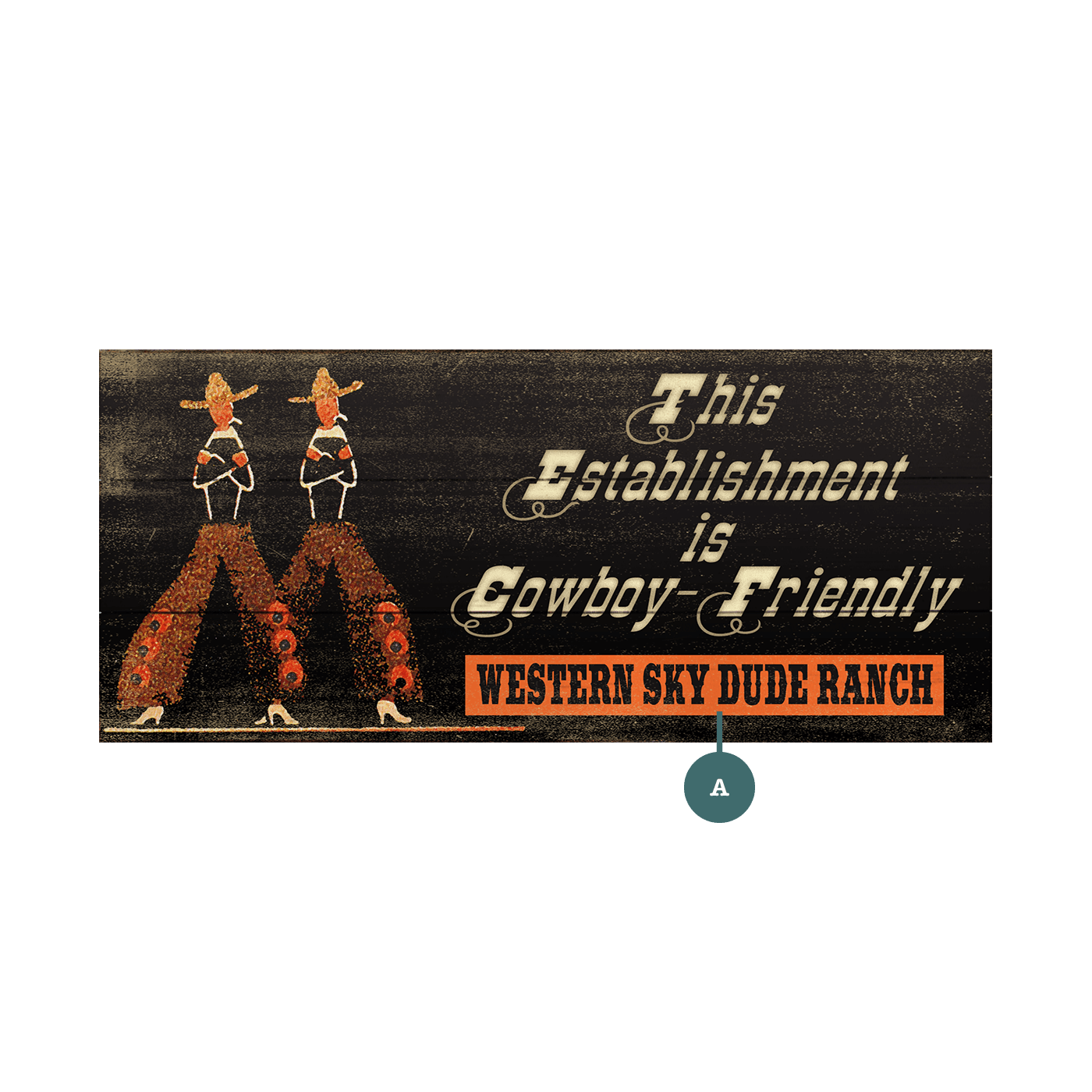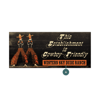 This vintage-style metal sign brings a bold and playful nod to cowboy culture with its eye-catching design and rugged Western charm. Featuring two whimsically illustrated cowboys with exaggerated chaps, the artwork captures a lighthearted yet nostalgic feel, reminiscent of classic roadside ranch signs. The distressed black background and stylized lettering enhance its rustic appeal, giving it an authentic aged look. The bold typography emphasizes the welcoming message, making it a perfect addition to saloons, barns, western-themed bars, or any space that embraces the spirit of the open range and frontier hospitality.