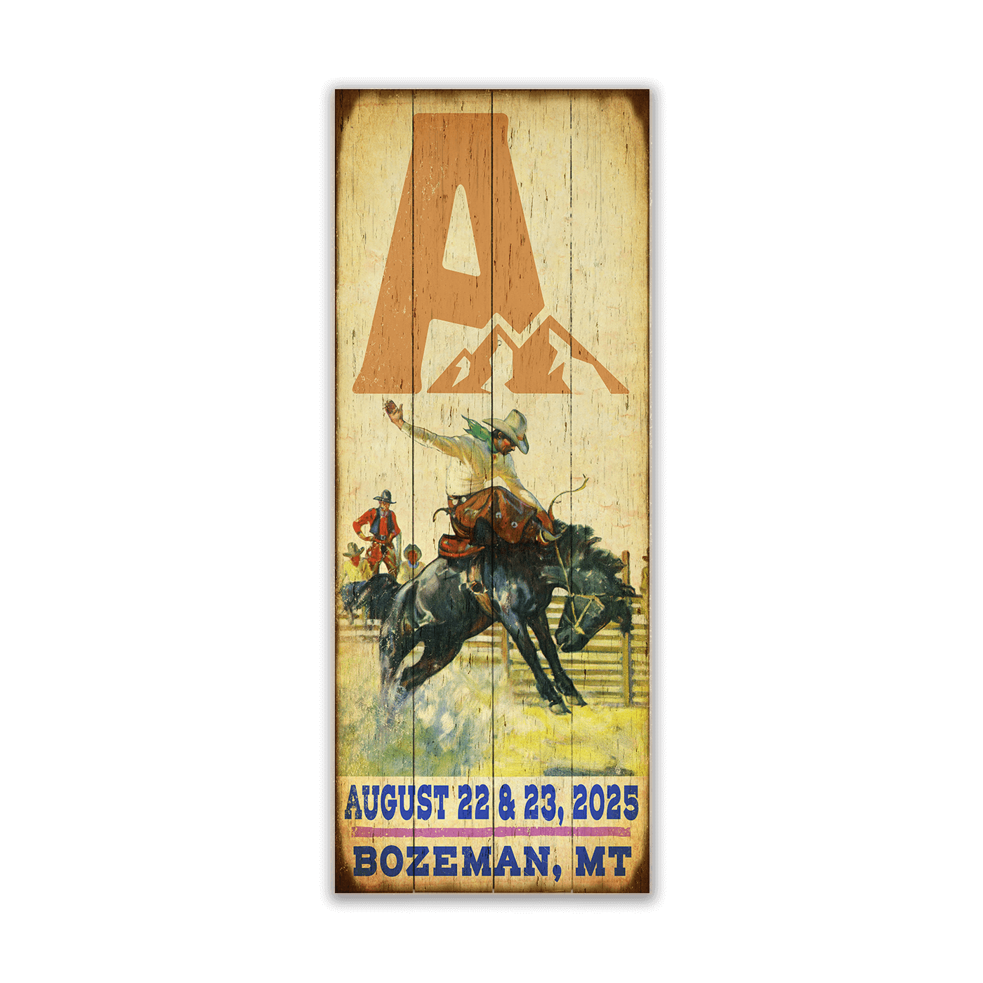 Capture the excitement of rodeo and the spirit of celebration with this striking Alpenglow Festival sign. Featuring a dramatic bronc rider mid-ride and one of the festival’s signature mountain “A” logos rising above the scene, the design blends action, artistry, and Western heritage. Weathered textures and bold block lettering emphasize the thrill of high-stakes competition and Big Sky Country tradition. Ideal for music fans, rodeo lovers, or anyone who lives for the energy of the arena and the rhythm of the open range, this special edition piece adds a bold statement to any space.