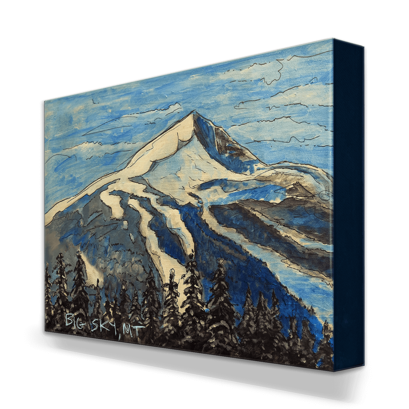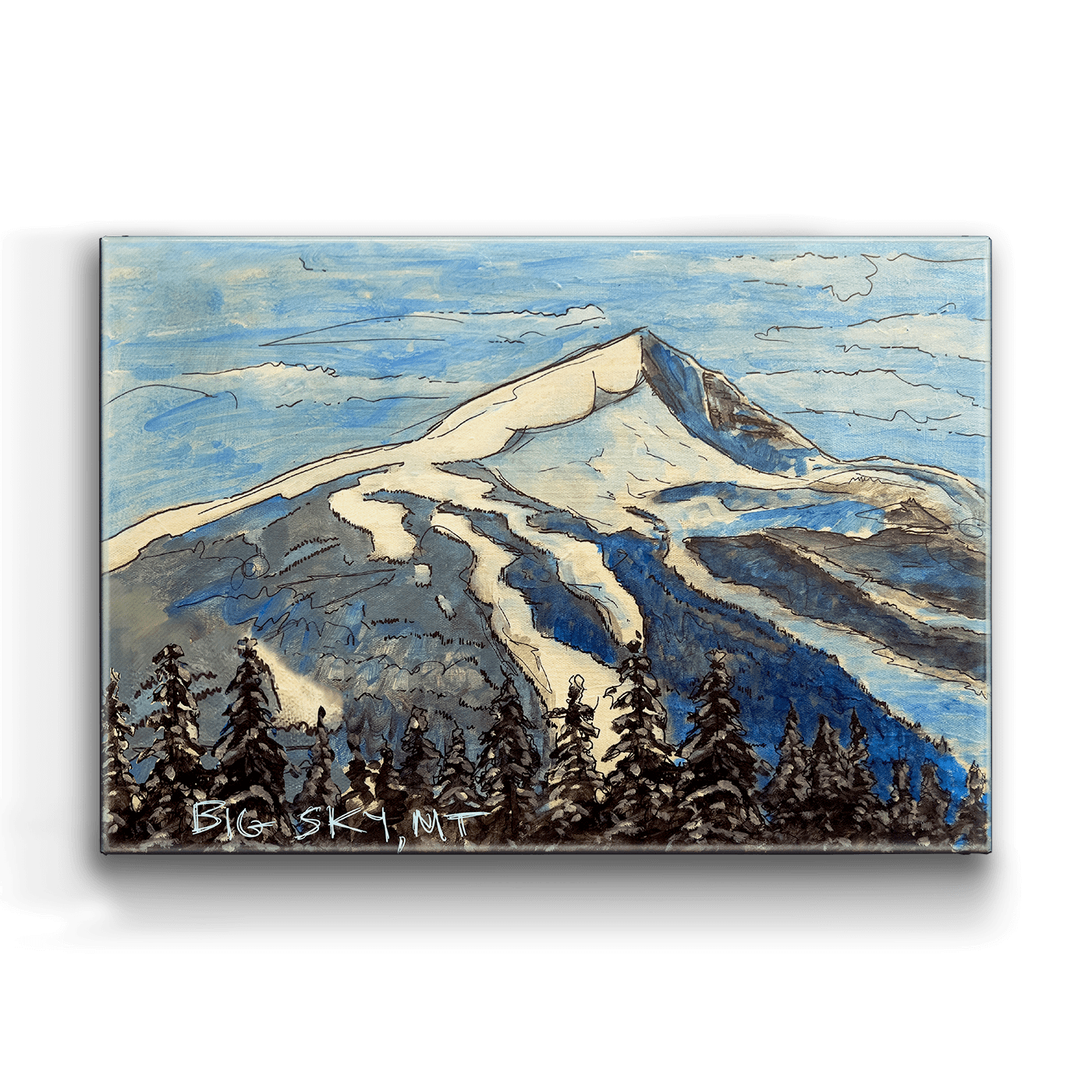 Capture the majesty of Lone Mountain in Big Sky, Montana, with this expressive alpine landscape. The sweeping brushstrokes and cool tones highlight the dramatic summit and winding ski trails that define one of the West’s premier ski destinations. A striking celebration of mountain grandeur and the serene beauty of Big Sky Country.