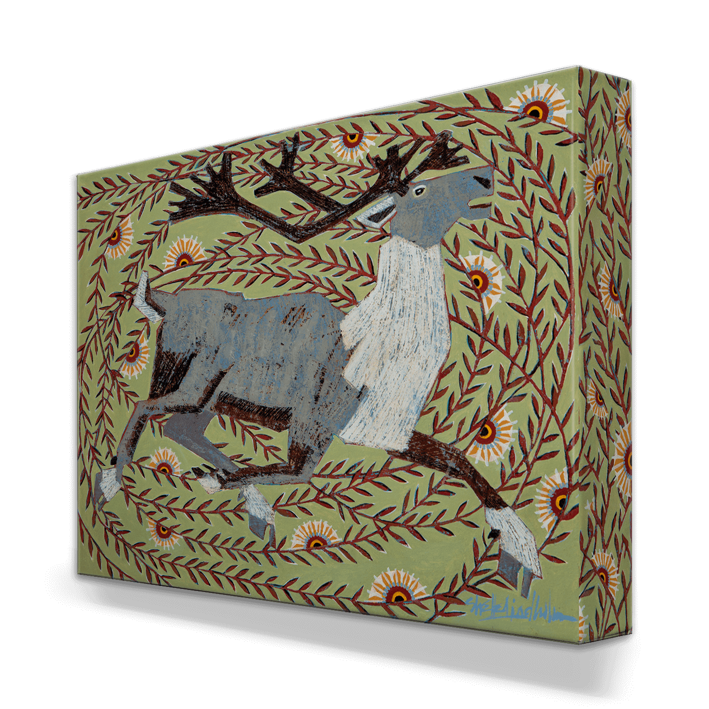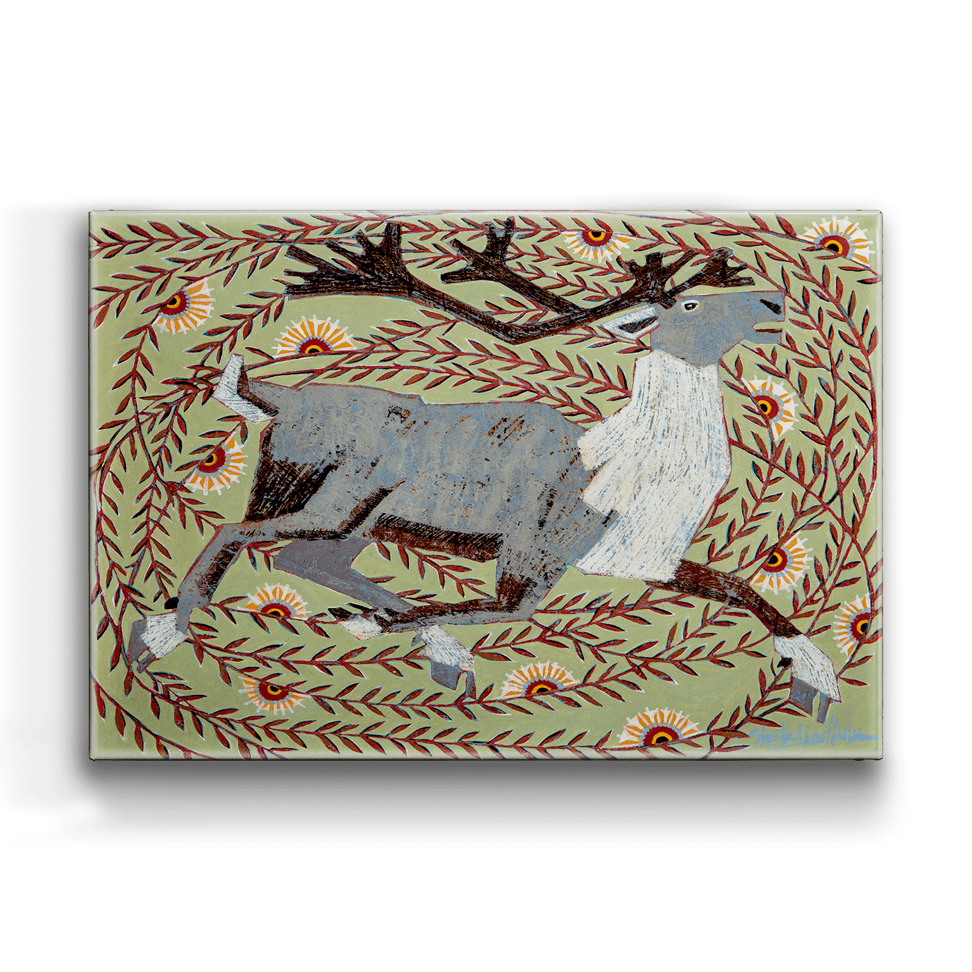 This vibrant artwork showcases a majestic caribou surrounded by a lively pattern of foliage and flowers. The piece's dynamic movement and intricate detailing capture the energy and beauty of the natural world. With its earthy tones and whimsical design, this caribou artwork is perfect for nature lovers and those who appreciate wildlife-themed décor. Whether displayed in a home or office, this artwork adds a touch of the wild outdoors and serves as a unique, eye-catching piece for any space.
