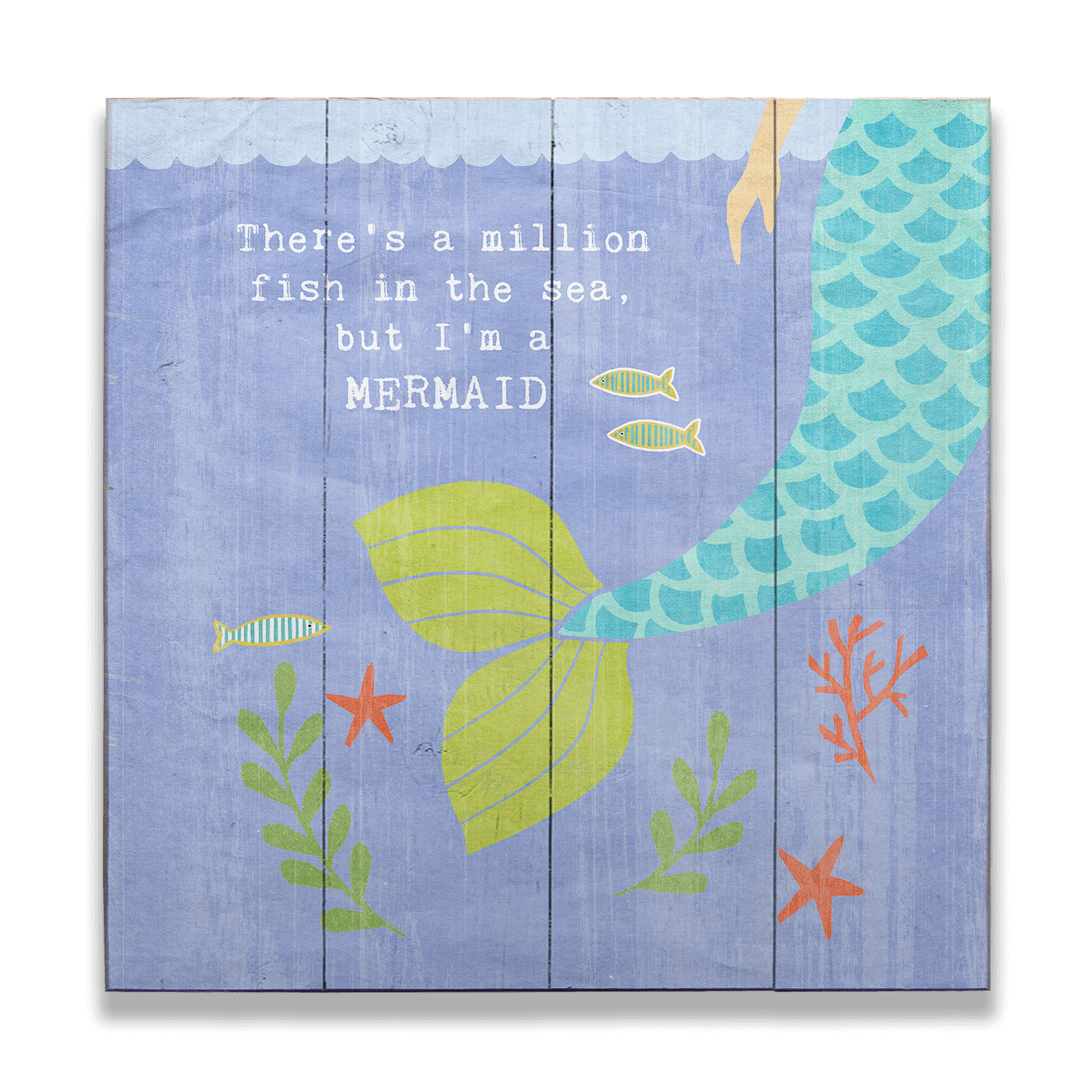 Dive deep into a sea of uniqueness with this 'A Million Fish in the Sea' wall art. This charming piece features the playful quote, 'There's a million fish in the sea, but I'm a MERMAID,' set against a beautifully distressed backdrop that evokes the calming essence of the ocean. With its vivid colors and whimsical design, this artwork is perfect for those who identify with the enchanting and distinctive nature of mermaids. Ideal for adding a personal touch to any coastal decor, nursery, or bedroom, this piece is sure to inspire and delight anyone who believes in the magic of being unique.