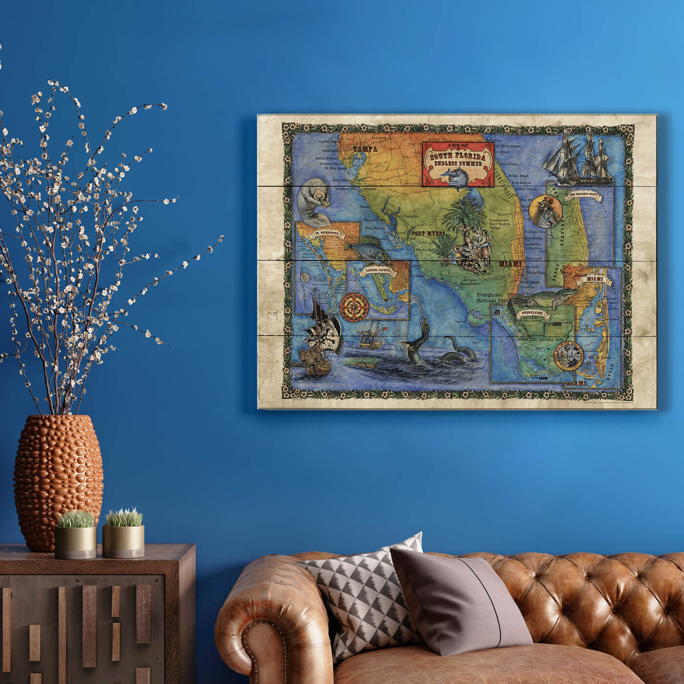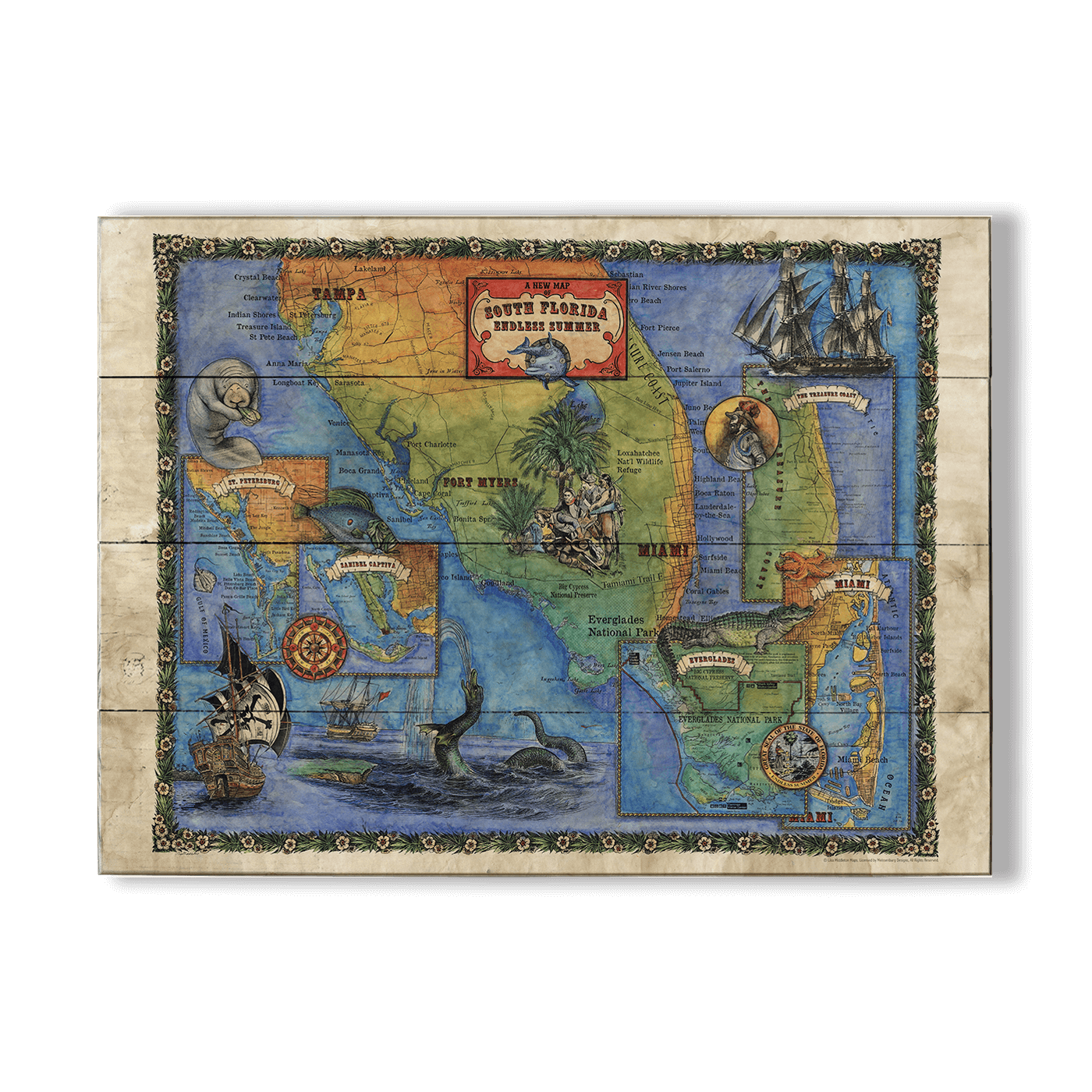 Dive into the colorful and adventurous spirit of South Florida with this captivating vintage-style map. This artistic depiction not only showcases the geographic layout of South Florida's most iconic regions, from Tampa to the Keys, but also brings to life the area's rich marine and cultural heritage. Illustrated with vibrant scenes of maritime adventures, lush landscapes, and exotic wildlife, this map is a perfect blend of history and fantasy. Ideal for anyone enchanted by Florida's tropical allure, this piece makes a stunning addition to any home or office, offering a window into the sun-drenched shores and bustling ports of the Sunshine State.