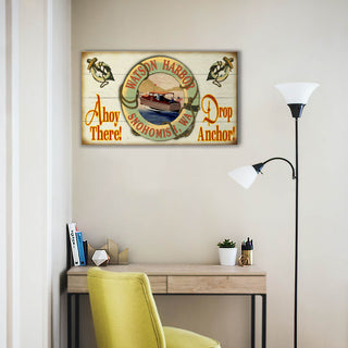 Welcome to a world of nautical charm with this vintage-style artwork. Featuring a classic boat sailing within a decorative lifebuoy, this piece exudes a sense of maritime adventure and relaxation. The vibrant colors and intricate details, along with the playful "Ahoy There!" and "Drop Anchor!" text, make it a delightful addition to any space. Perfect for those who appreciate retro aesthetics and love the sea, this artwork brings a touch of coastal elegance and timeless appeal to your home decor.