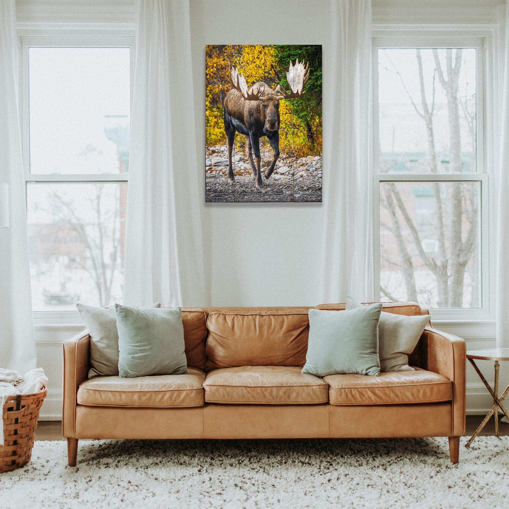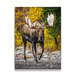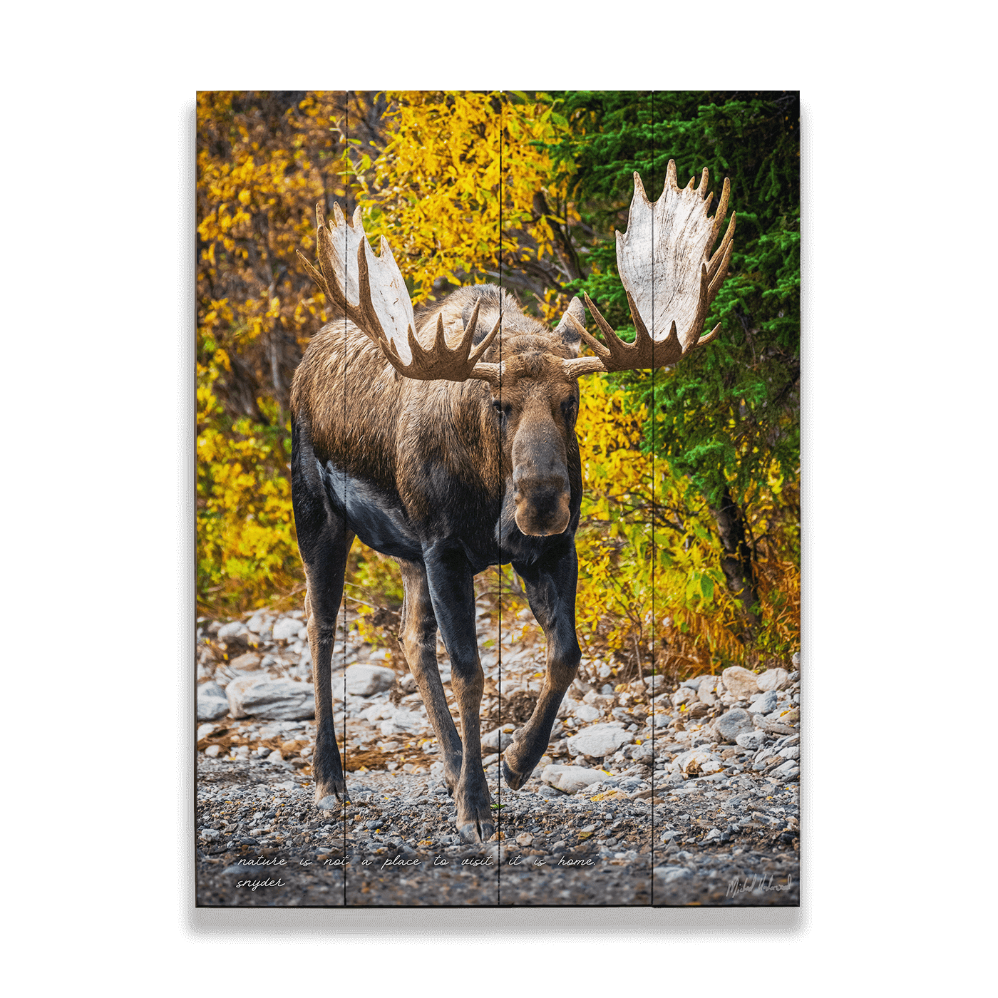 A regal moose with impressive antlers strides confidently across a rocky terrain, set against a backdrop of autumnal foliage. The striking contrast between the moose's dark fur and the vibrant yellow leaves celebrates the diversity and richness of the wilderness. This powerful creature's presence amidst the fall colors exemplifies the raw and majestic beauty of the natural world. Captivating viewers with its commanding gaze, the scene reminds us of the profound connection between wildlife and their habitat.