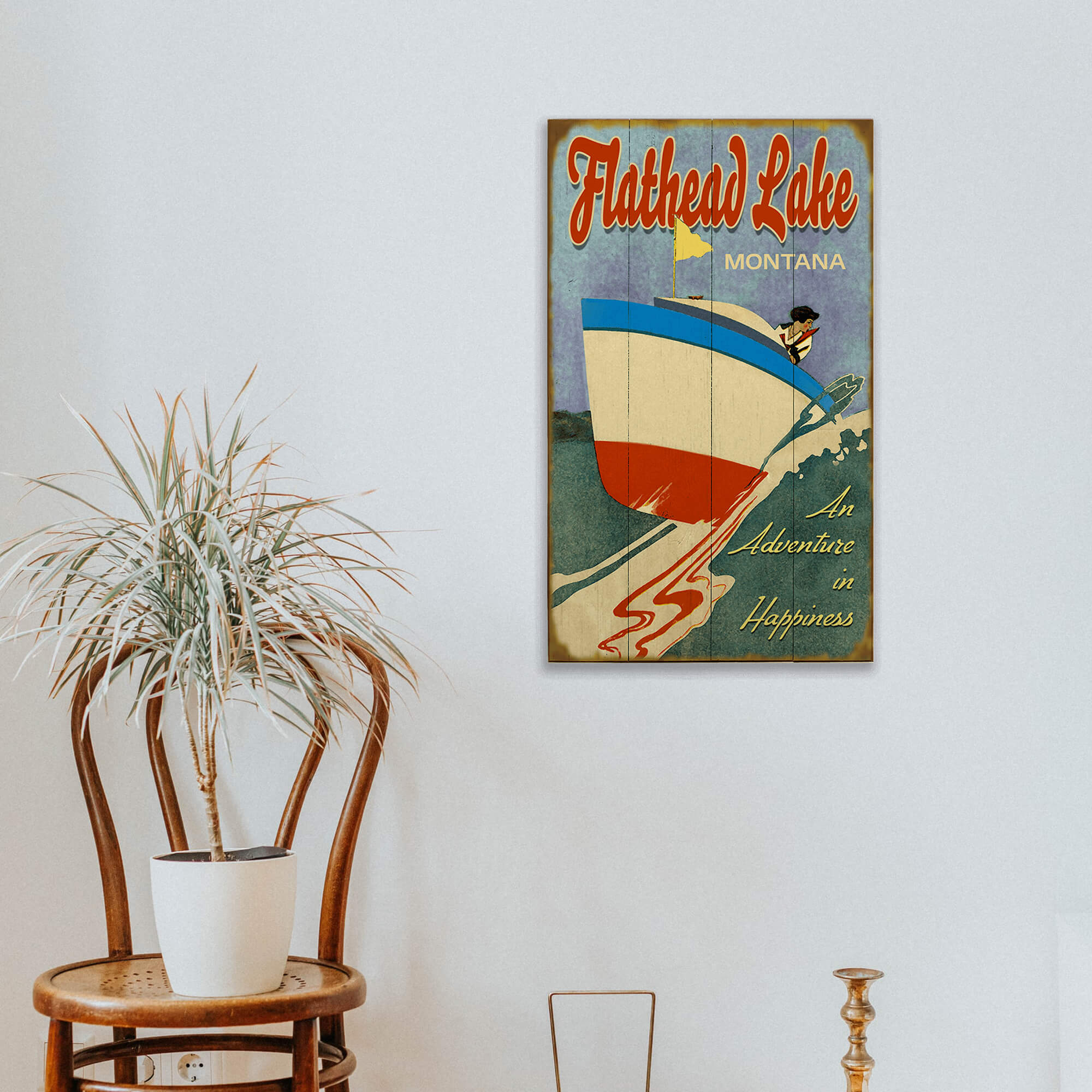 Capture the spirit of adventure and joy with this vibrant vintage-style artwork. Showcasing a dynamic scene of a speedboat cutting through the water with a sense of exhilaration, this piece radiates excitement and happiness. The bold colors and lively design make it a standout addition to any space, perfect for those who love nautical themes and retro charm.