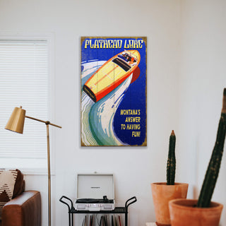 Embrace the excitement of water sports with this vibrant vintage-style artwork. Featuring a dynamic speedboat cutting through the waves, this piece captures the thrill and fun of boating adventures. The bold colors and energetic design make it a standout addition to any space, perfect for those who love nautical themes and retro charm.