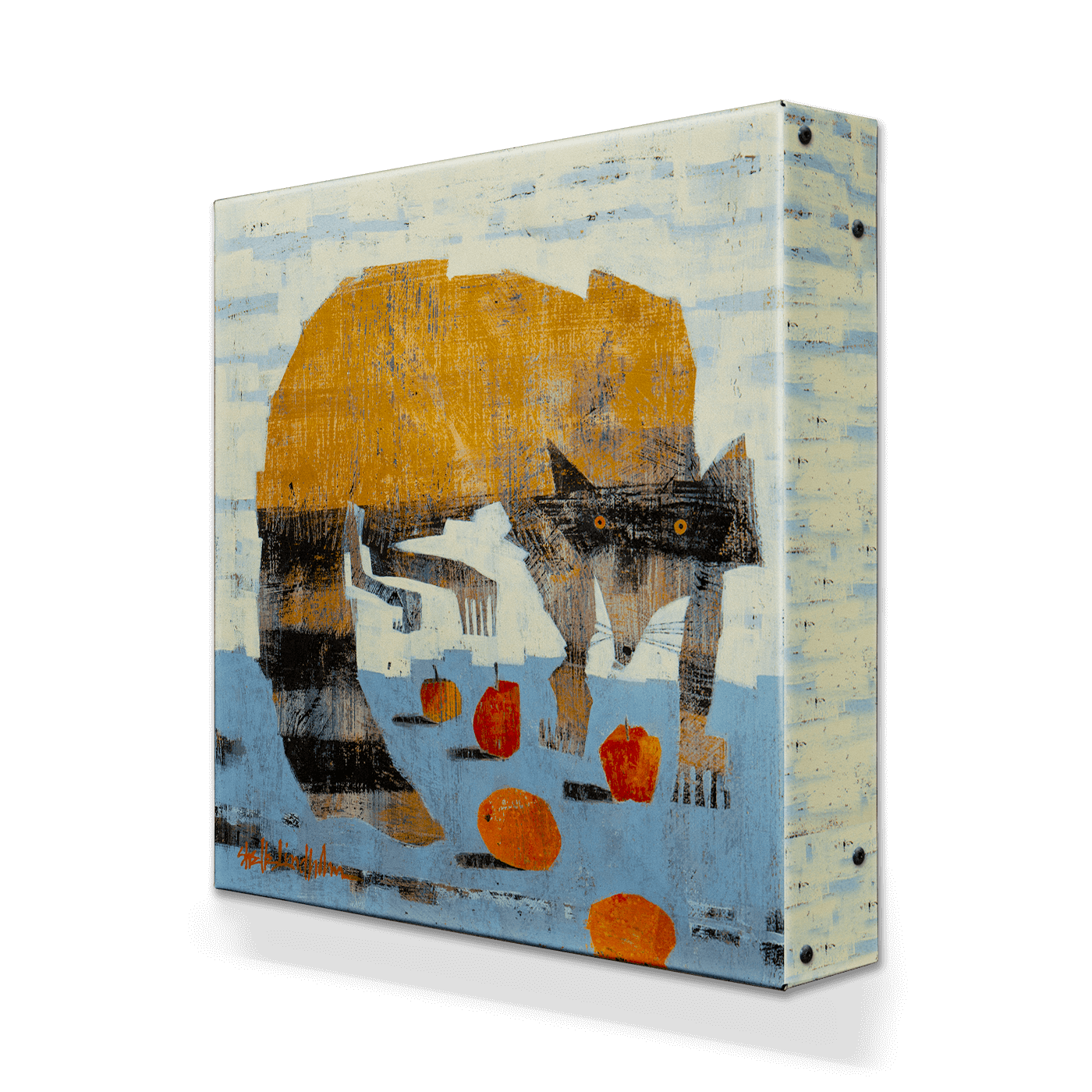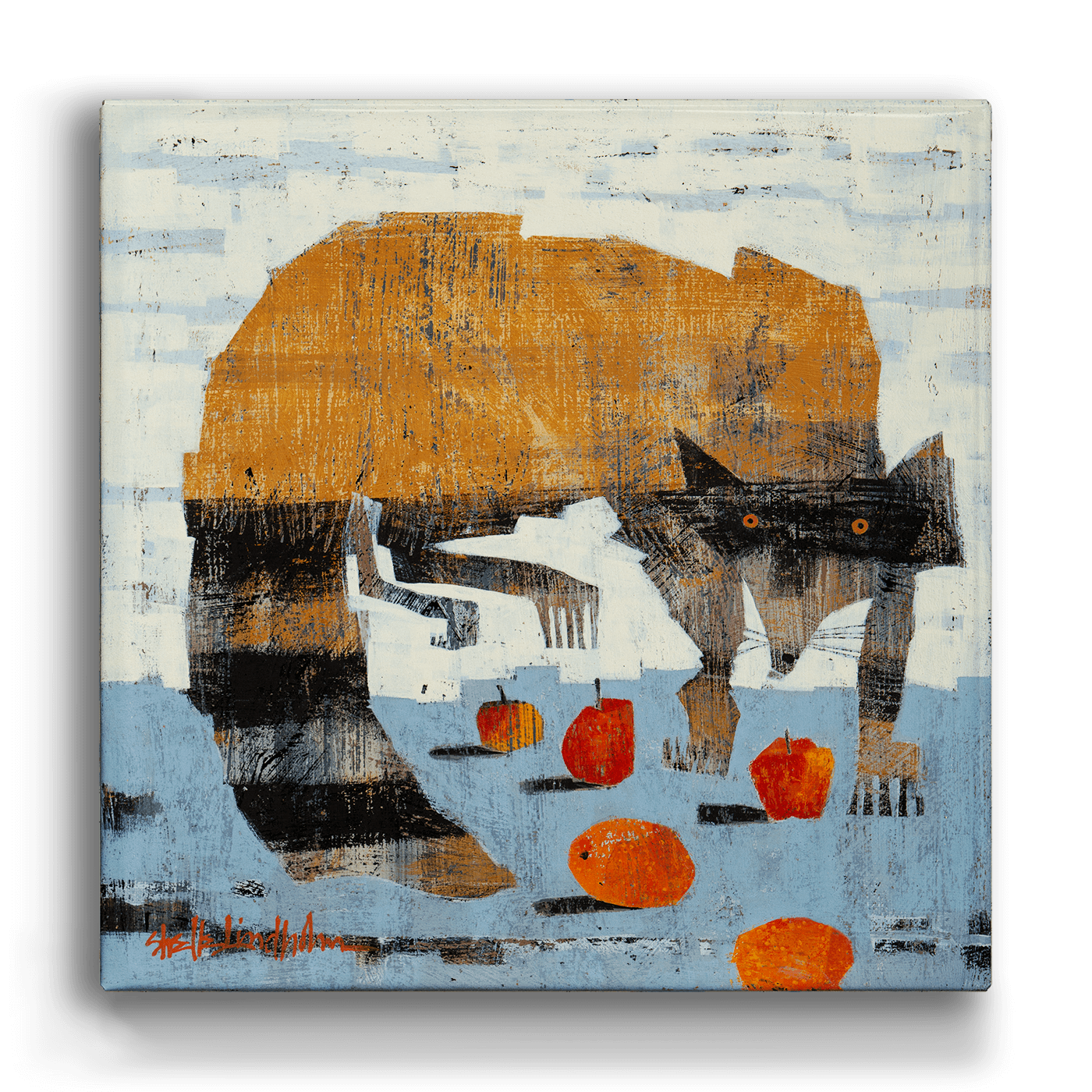 This captivating artwork features a bold, abstract depiction of a raccoon, guarding its treasured snacks of apples and oranges. The textured, modern style gives this piece a dynamic and playful energy, while the earthy tones highlight the raccoon's cautious stance and sharp gaze. Perfect for those who enjoy nature-themed art with a whimsical twist, this raccoon artwork adds character and creativity to any space. It's an excellent choice for art lovers who appreciate unique, contemporary interpretations of wildlife.