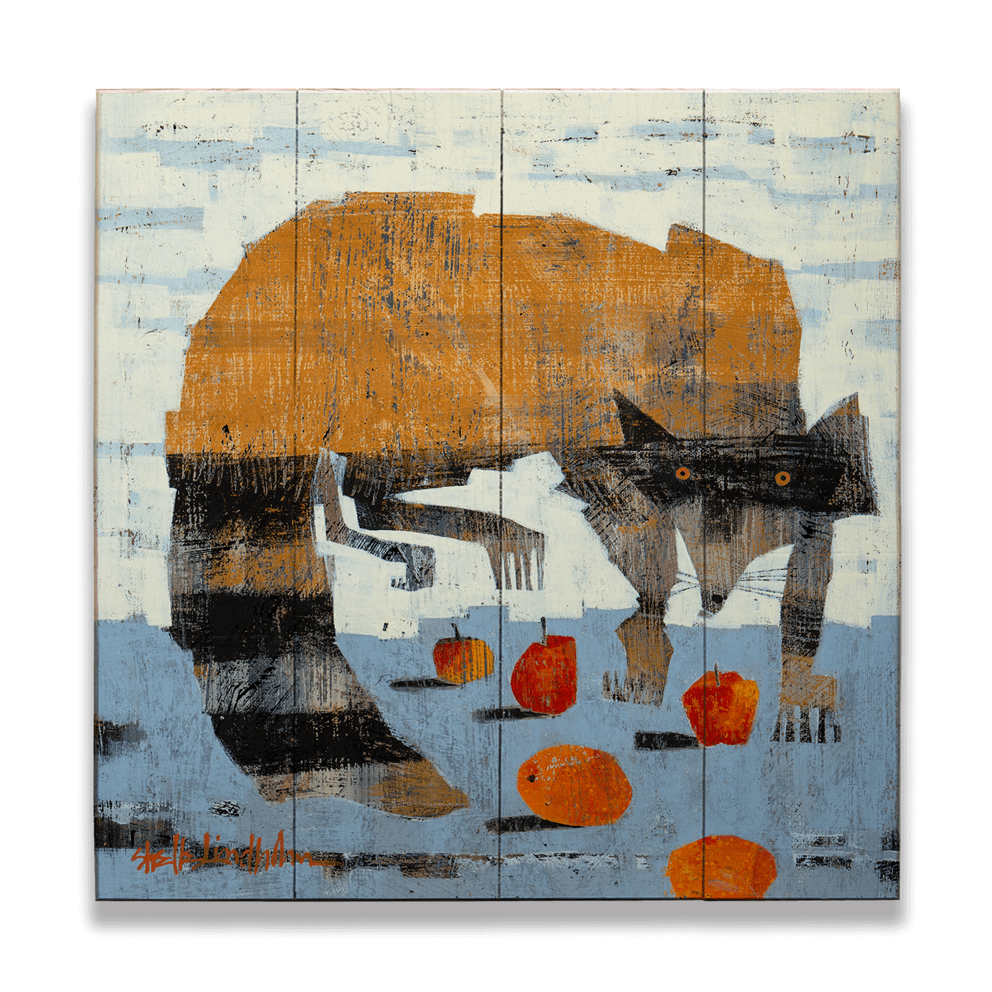 This captivating artwork features a bold, abstract depiction of a raccoon, guarding its treasured snacks of apples and oranges. The textured, modern style gives this piece a dynamic and playful energy, while the earthy tones highlight the raccoon's cautious stance and sharp gaze. Perfect for those who enjoy nature-themed art with a whimsical twist, this raccoon artwork adds character and creativity to any space. It's an excellent choice for art lovers who appreciate unique, contemporary interpretations of wildlife.