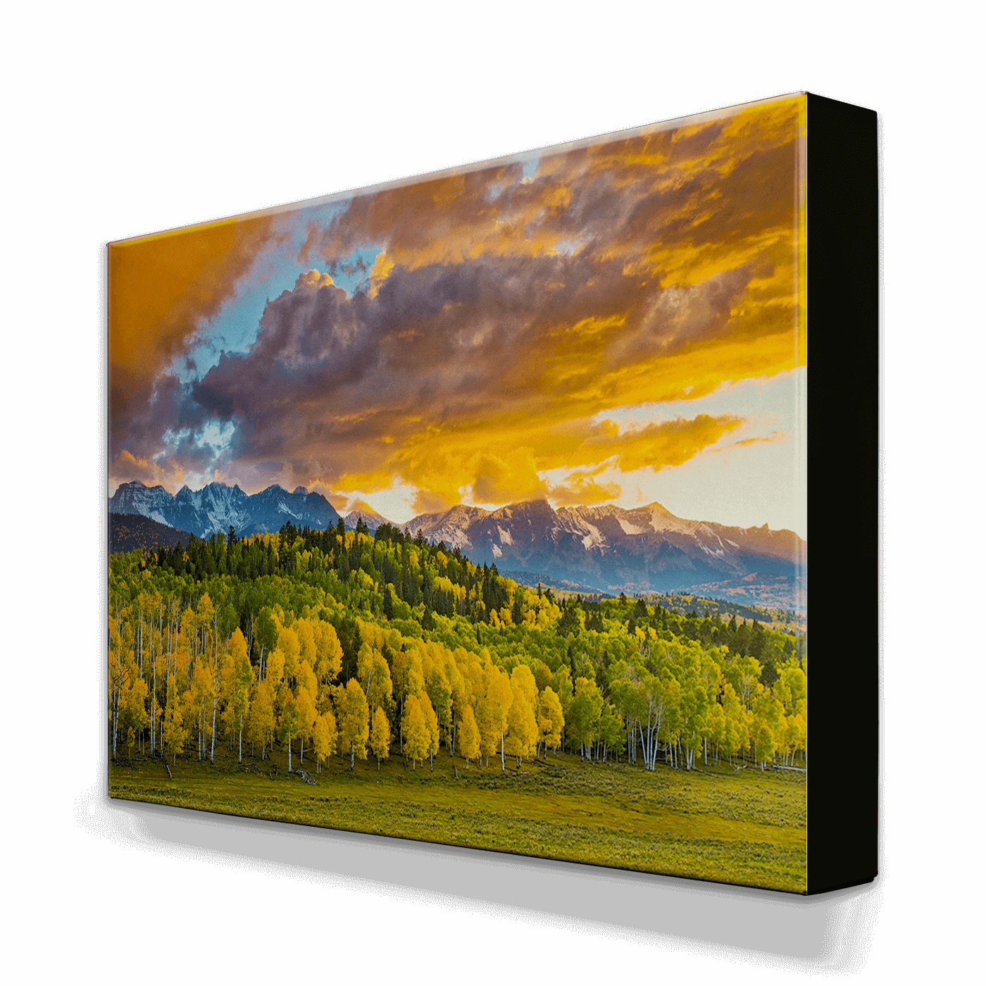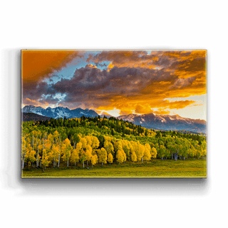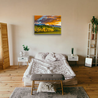 Experience the vibrancy of fall with Autumn Sunset, a stunning print that captures the essence of the season. The golden hues of aspen trees set against a dramatic mountain backdrop and a fiery sunset sky make this piece a captivating addition to any space. Perfect for those looking to bring the warmth and splendor of autumn indoors, this print is a conversation starter and a soothing vista for both home and office environments. Elevate your decor with this burst of nature's beauty, where the vivid colors promise to remain rich and lively through the changing seasons.