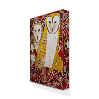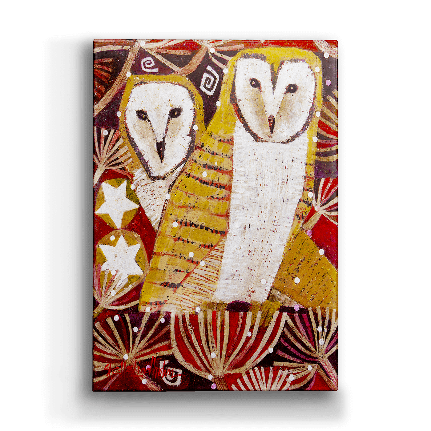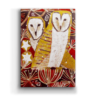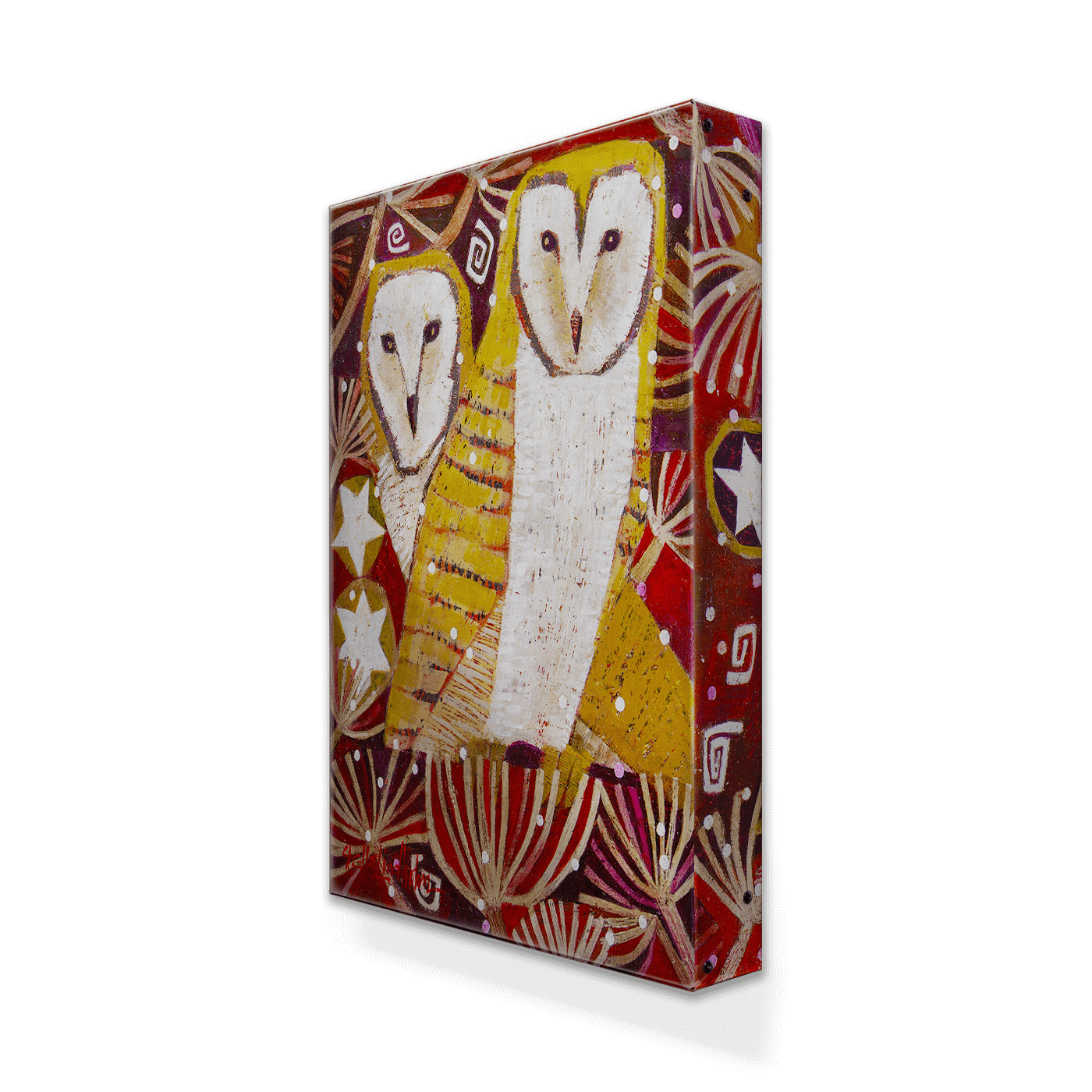 This stunning artwork features a pair of graceful barn owls with intricate detailing, set against a vibrant red background adorned with dazzling star motifs and geometric patterns. The rich golden tones of the owls contrast beautifully with the warm, decorative elements, creating a sense of elegance and wonder. Perfect for adding a bold yet refined touch to your space, this piece is ideal for nature lovers, art enthusiasts, or anyone looking to incorporate a striking centerpiece into their decor.