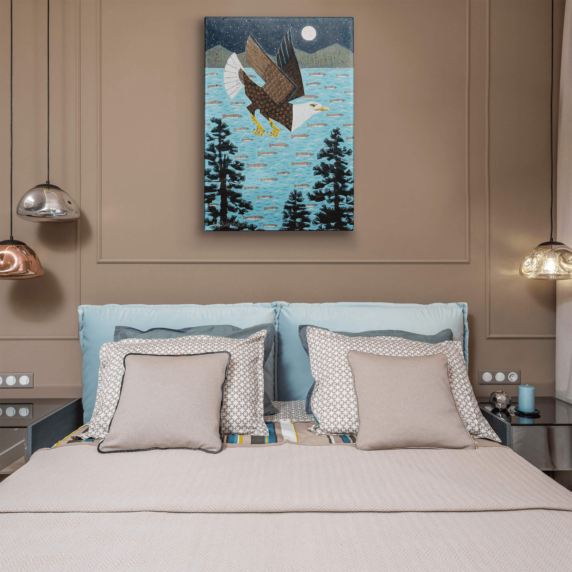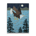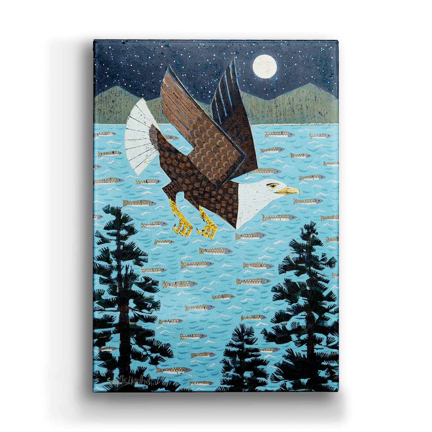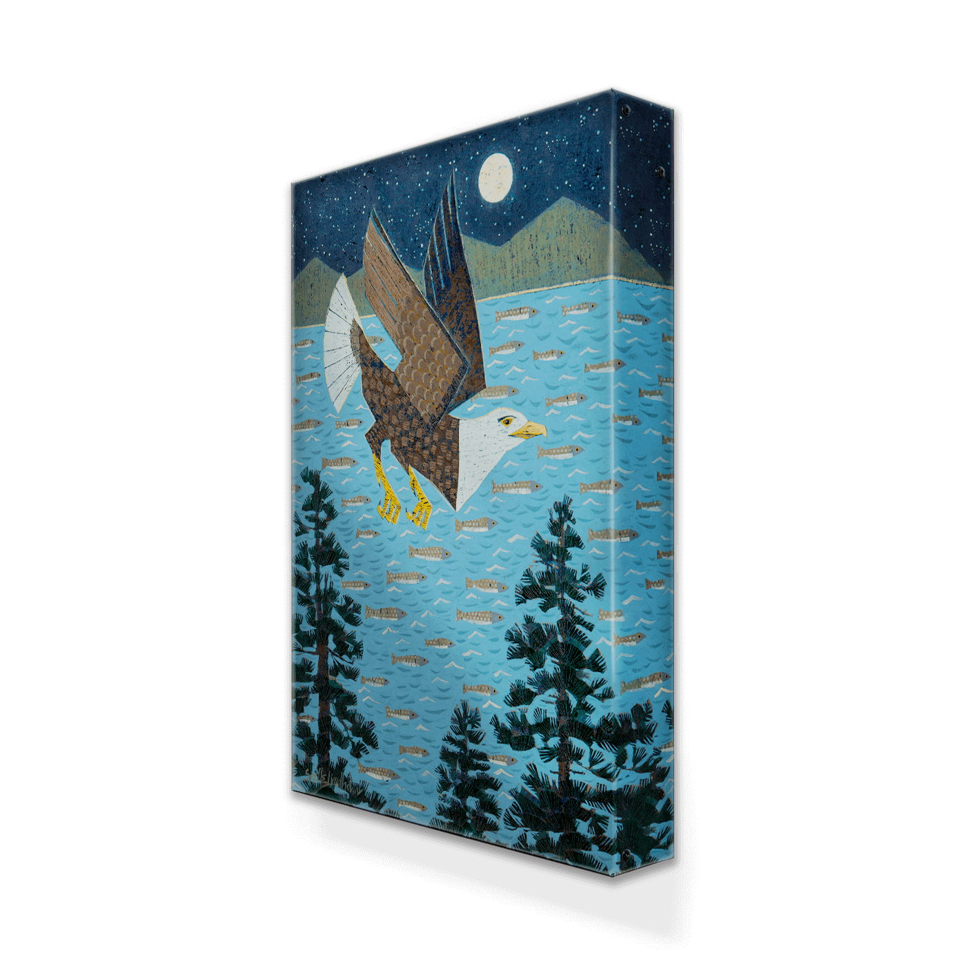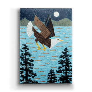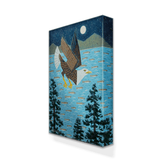 This captivating artwork showcases a majestic bald eagle in flight under a moonlit sky, surrounded by trees and a bay filled with fish. The detailed design and rich textures capture the beauty of nature and the power of the eagle, symbolizing freedom and strength. Perfect for wildlife enthusiasts and nature lovers, this piece adds a sense of serenity and adventure to any space. Ideal for rustic or modern décor, it brings the spirit of the wilderness indoors.