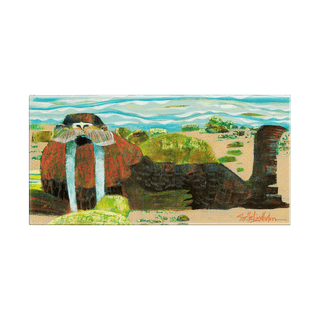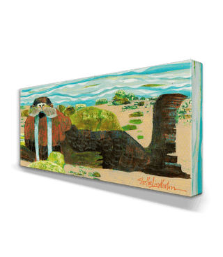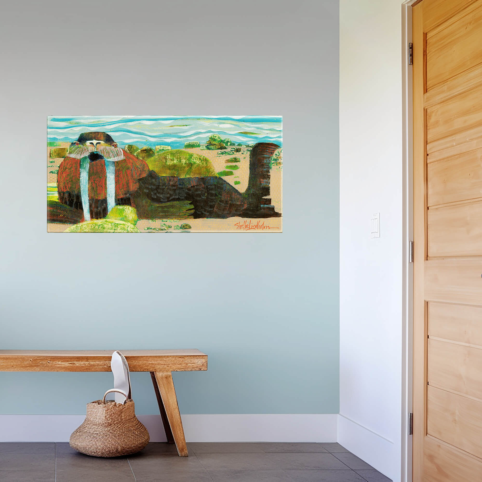 This captivating piece features a lounging walrus with vibrant colors and abstract textures that evoke the rugged beauty of its coastal habitat. The artist’s use of earthy greens and soft blues gives the scene a tranquil yet whimsical feel, making it a perfect addition to any art collection that celebrates wildlife or coastal landscapes.