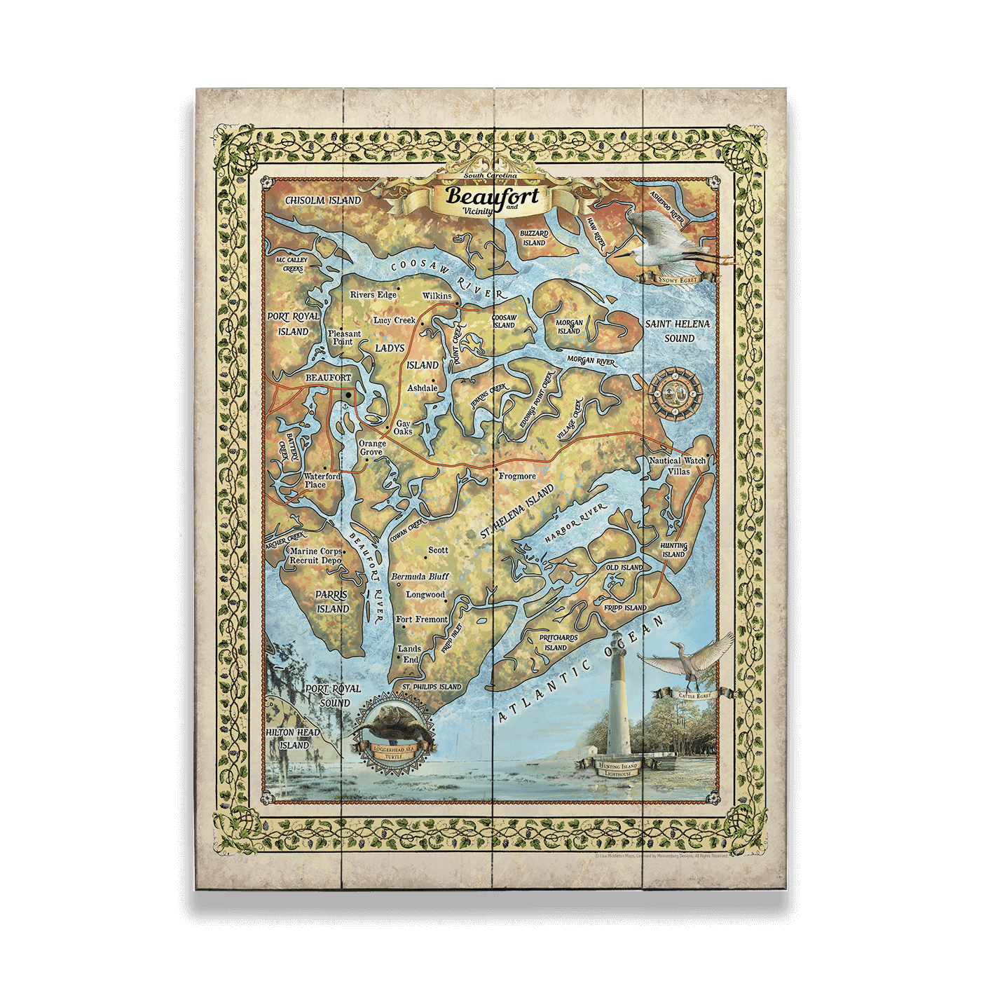 Explore the rich history and natural beauty of Beaufort, South Carolina with our stunning decorative map. Expertly crafted from high-quality wood or metal, this vintage-style map will add a touch of elegance to any room in your home or office. The intricate details of the map showcase the city's scenic views and historic locations, including its famous filming locations for movies like Forrest Gump and The Prince of Tides.