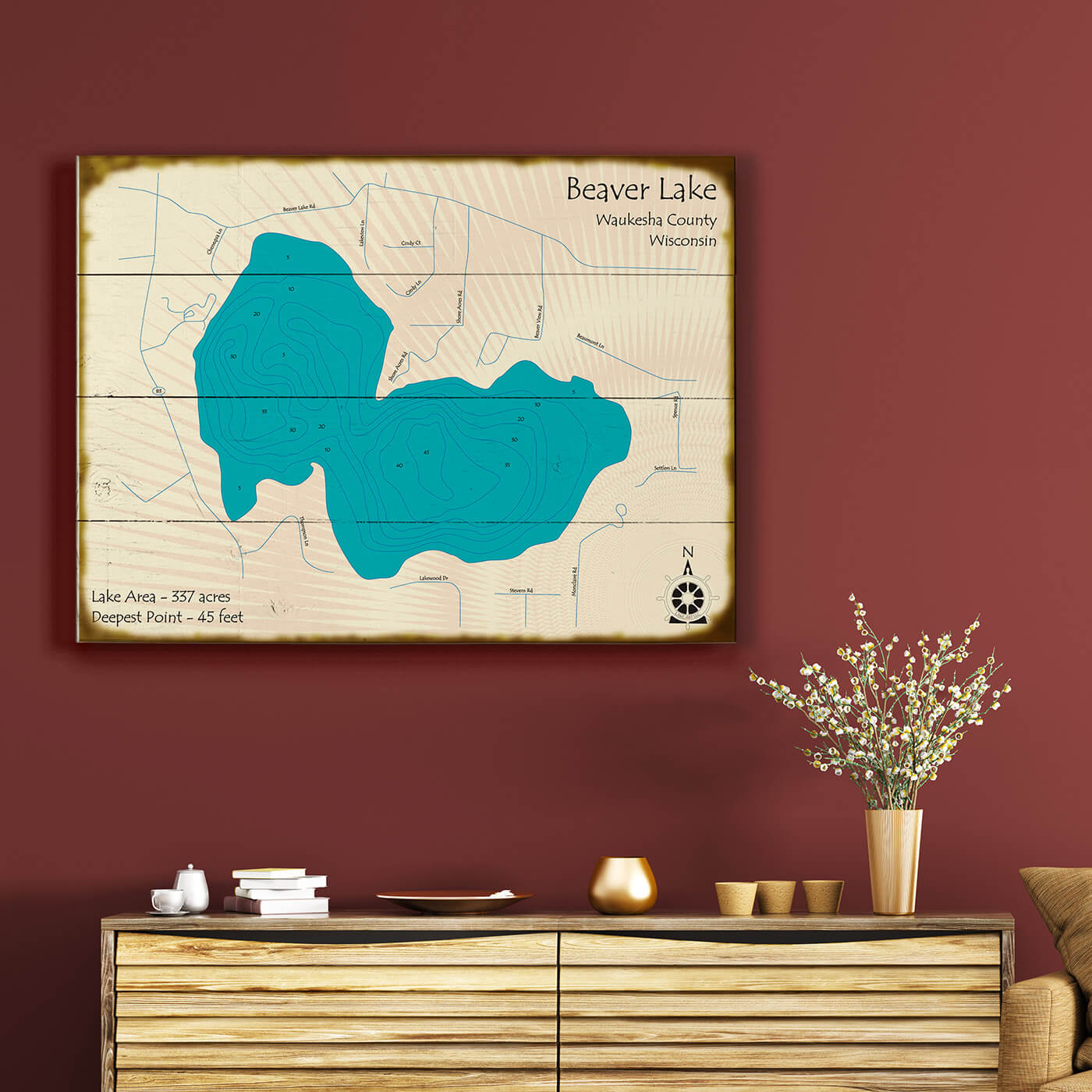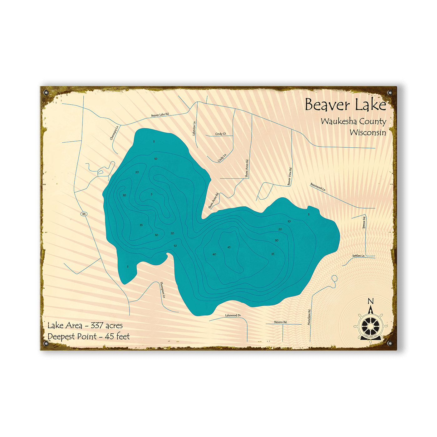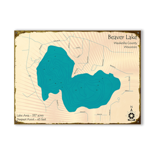 Our vintage map of Beaver Lake, Wisconsin is the perfect way to capture the beauty and history of this stunning location. Nestled in the heart of the Ozark Mountains, Beaver Lake is a man-made reservoir formed by a dam across the White River. It spans over 487 miles (784 km) of shoreline and is surrounded by towering limestone bluffs, natural caves, and a diverse array of trees and flowering shrubs.