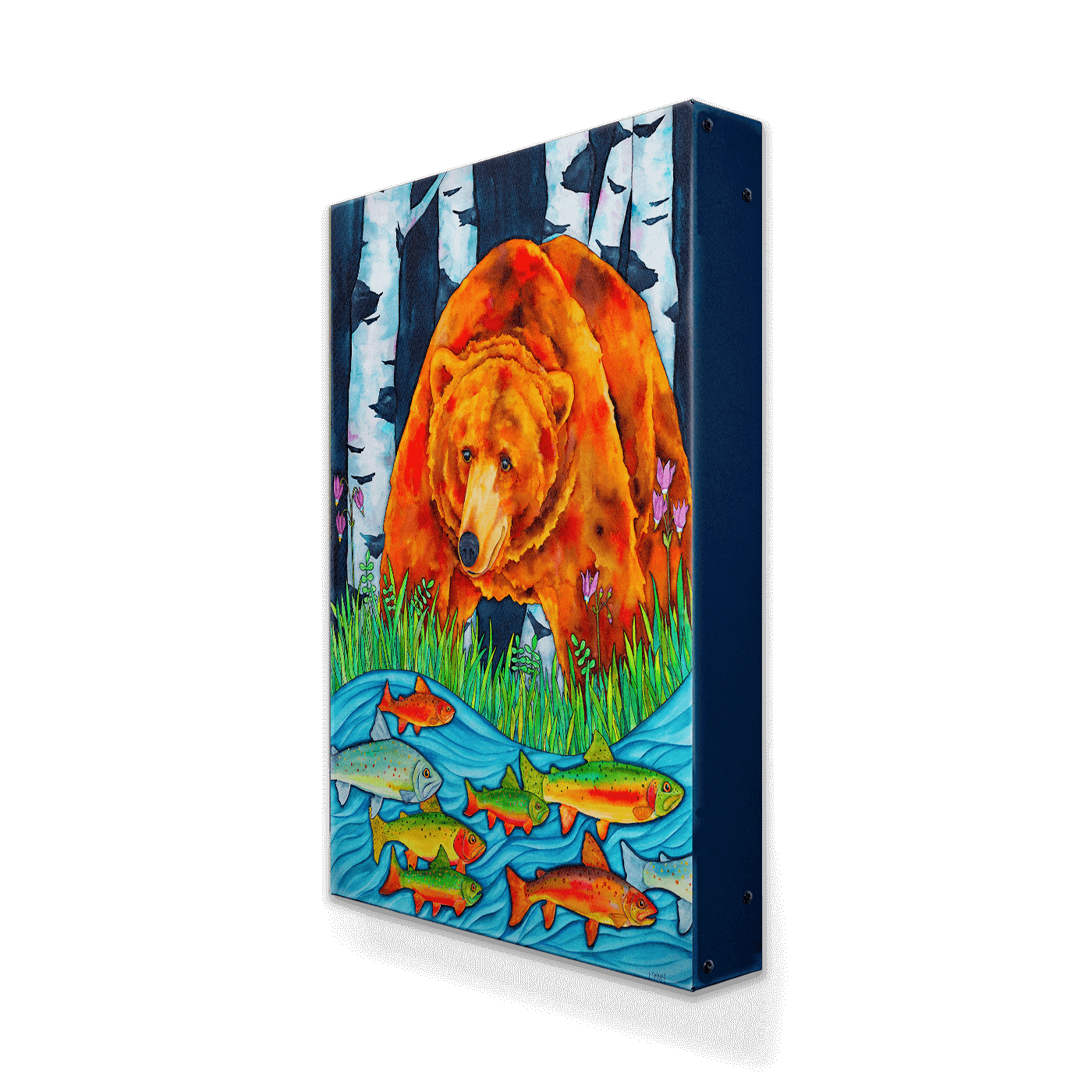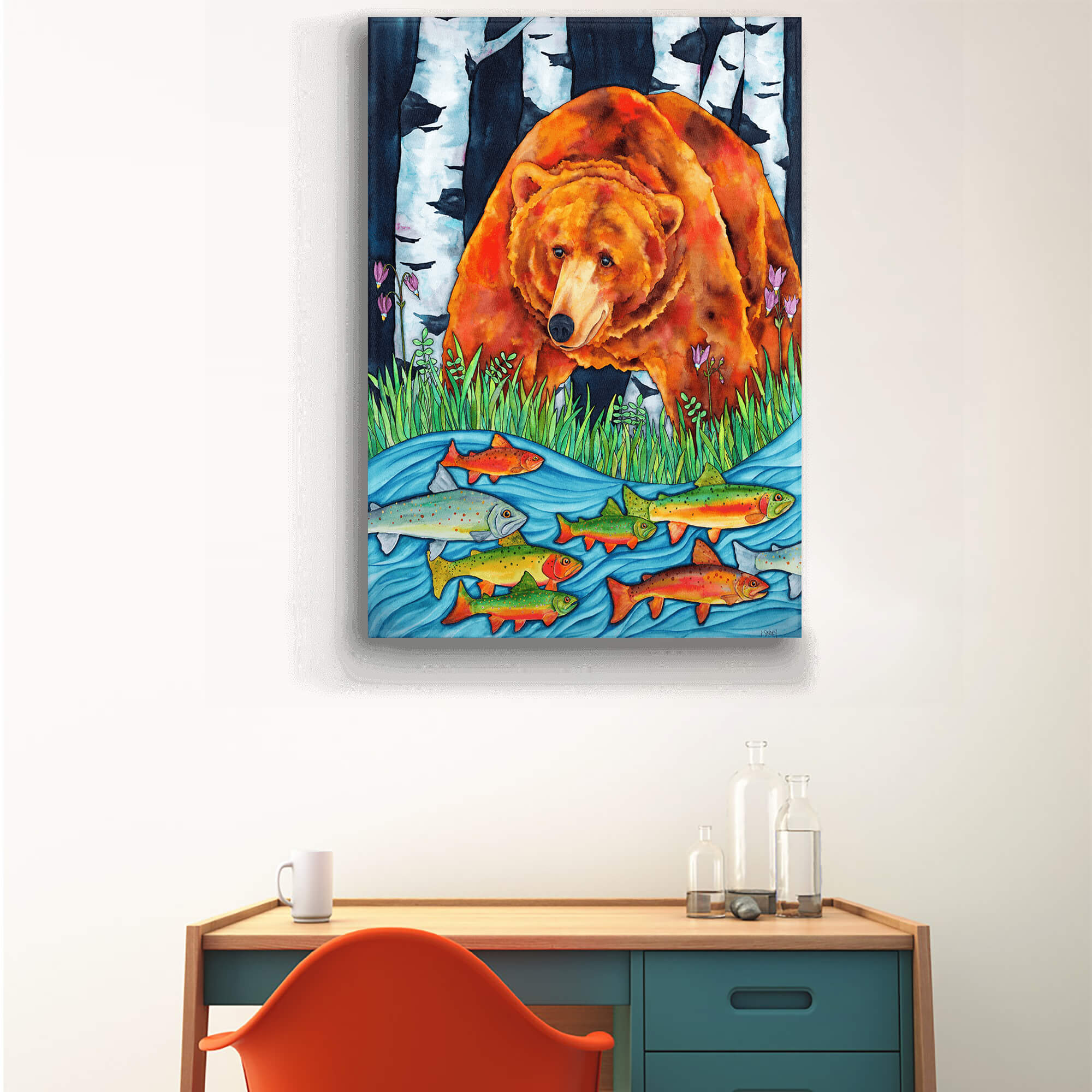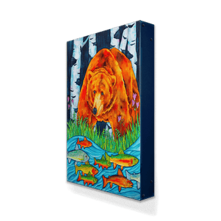 Dive into the vivid wilderness with this stunning watercolor painting that captures a majestic grizzly bear overlooking a river teeming with colorful trout. Set against a backdrop of shadowy birch trees, this artwork beautifully juxtaposes the bear's rich, fiery fur against the cool blues of the water, creating a visually striking scene. This piece celebrates the raw power and serene beauty of nature, making it a captivating addition to any wildlife art collection or a dramatic focal point in any living space.