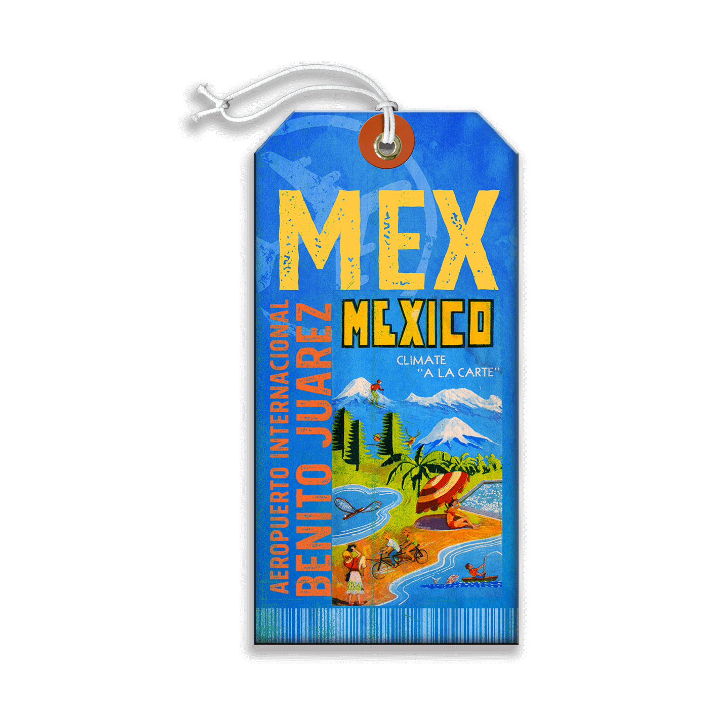 This artwork features a vintage-inspired luggage tag design for Mexico City's Benito Juarez International Airport (MEX). The tag captures the essence of Mexico's rich culture and natural beauty, showcasing colorful landscapes and iconic imagery. Whether used as a decorative accent in a travel-themed room or as a nostalgic reminder of past adventures, this artwork brings the vibrant spirit of Mexico City into your home.