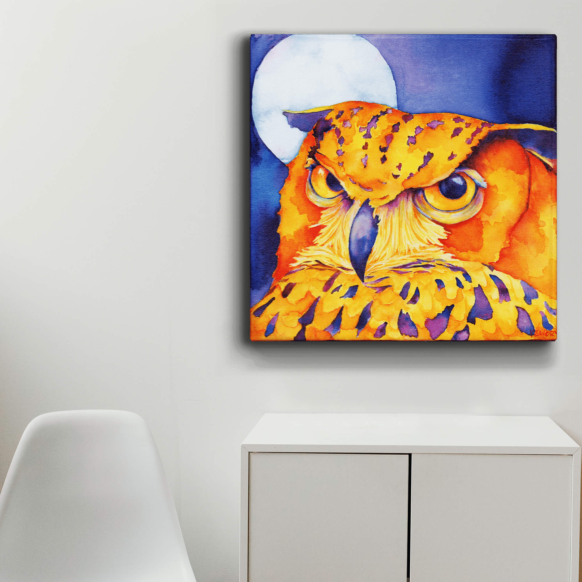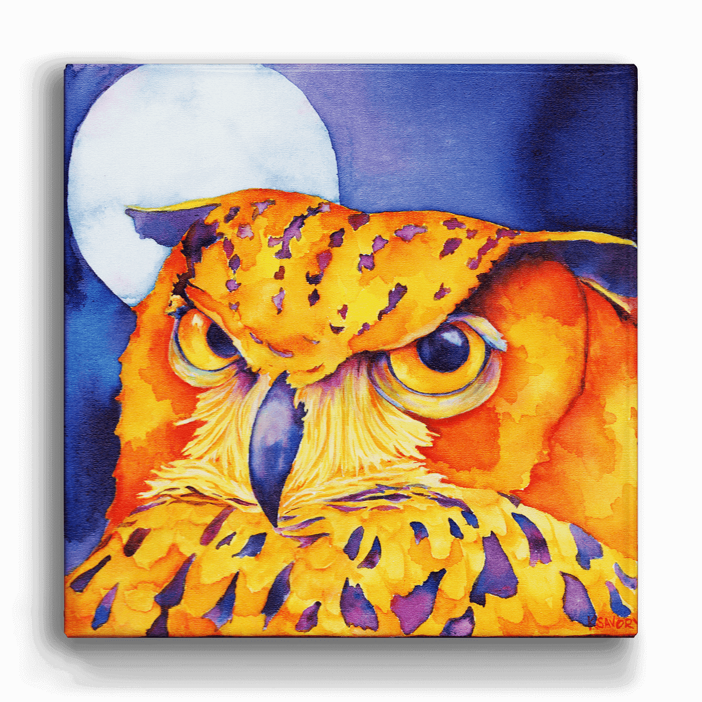 "Big, Bad, and Beautiful" captures the intense and mesmerizing gaze of a majestic owl, rendered in vibrant shades of orange and purple against a stark moonlit night. This striking artwork masterfully plays with color and texture to bring out the fierce beauty and mystery of one of nature's most revered birds. Perfect for wildlife enthusiasts and art collectors alike, this piece adds a bold statement to any space, inviting viewers to delve into the depths of the owl's captivating eyes and the subtle intricacies of its plumage.