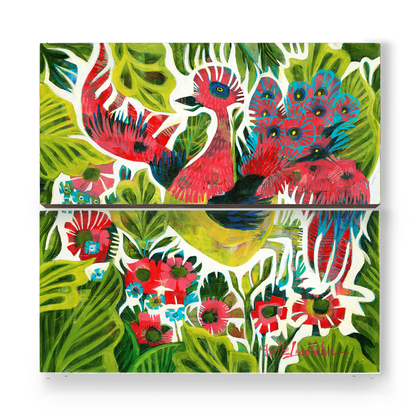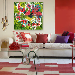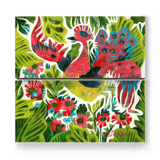 This vibrant artwork features a colorful Bird of Paradise set against a lush background of tropical foliage. The bold reds, greens, and blues create a lively and dynamic composition that captures the essence of nature's beauty. Perfect for adding a pop of color to any space, this piece embodies the energy and vitality of the jungle, making it an eye-catching addition to your art collection. The intricate details and vivid palette ensure this artwork stands out, offering a unique and captivating visual experience. Ideal for nature lovers and art enthusiasts alike.