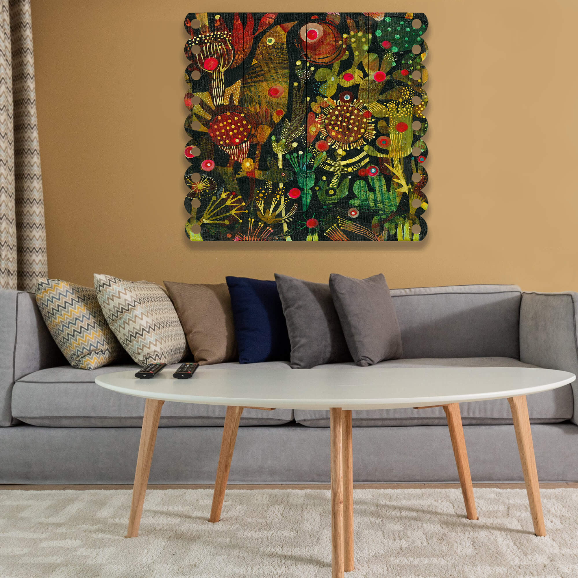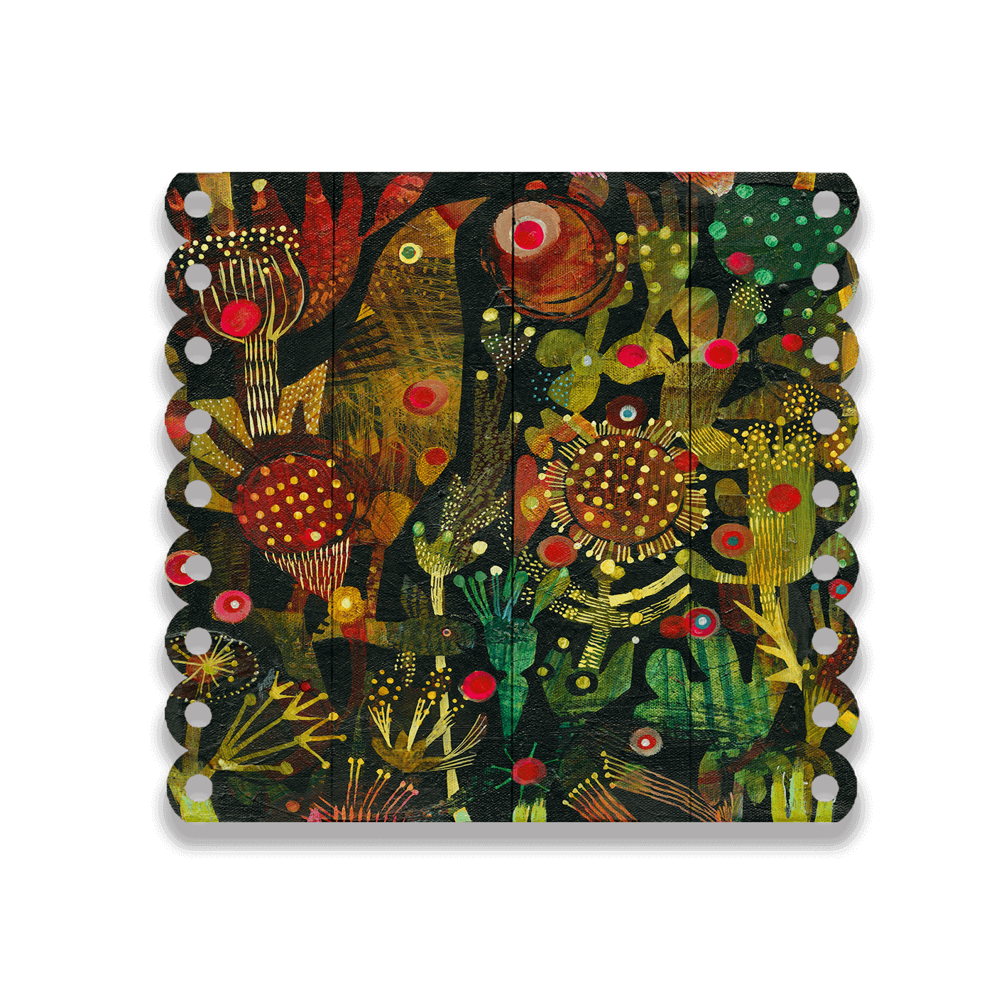 Unveil the mystery of the night garden with Esté MacLeod's "Birdfish", a dynamic piece that captivates the senses. The piece is a symphony of rich, dark tones punctuated by bold, luminescent hues, embodying Esté's distinctive fusion of textile patterns and ceramic motifs. It is a dance of stylized flora and fauna, where each brushstroke contributes to a narrative that is both lush and magical.