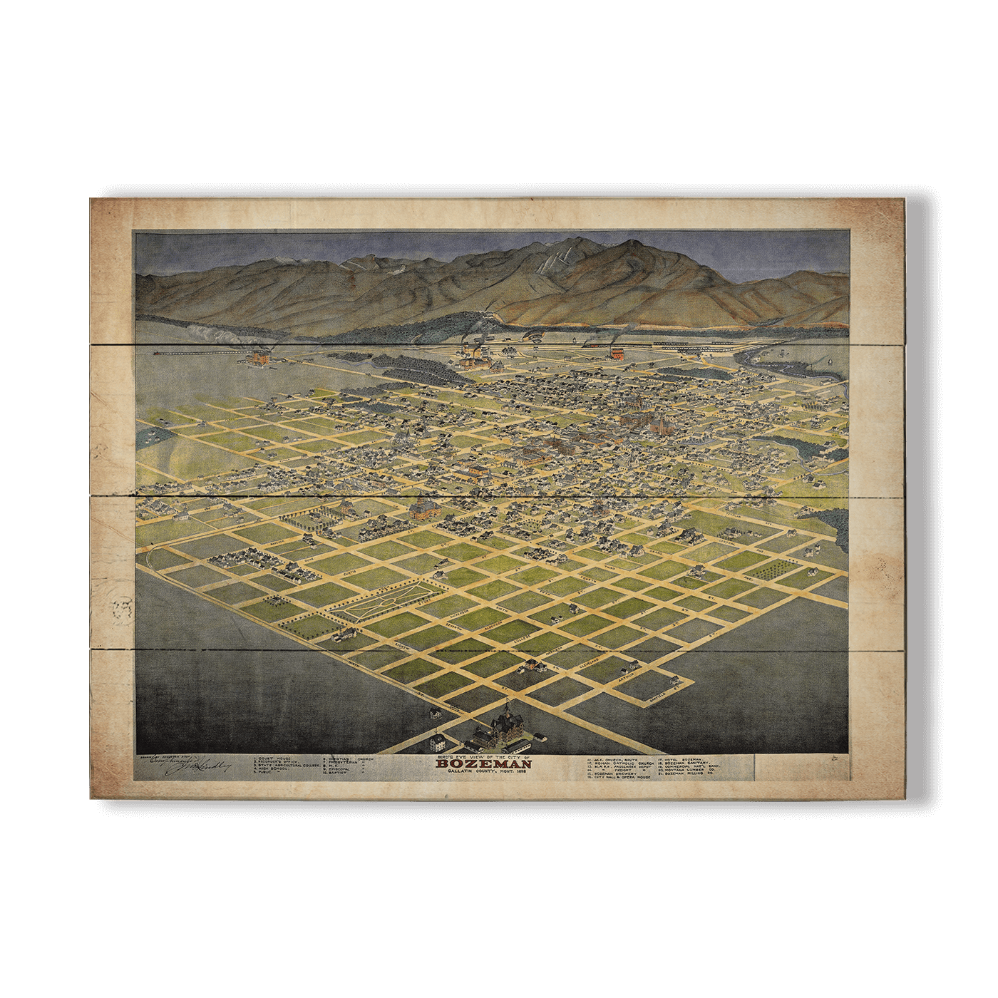 Step back in time with this detailed bird's-eye view map of Bozeman, Montana, from the late 19th century. This historic map captures Bozeman's early development with incredible detail, showing the streets, buildings, and natural surroundings as they were over a century ago. The rich texture and muted colors lend an air of antiquity, making this piece a perfect addition for history enthusiasts or anyone with a connection to Bozeman. Ideal for display in homes, offices, or educational settings, this map not only serves as a beautiful piece of art but also as a fascinating historical document that offers a glimpse into Montana's past.
