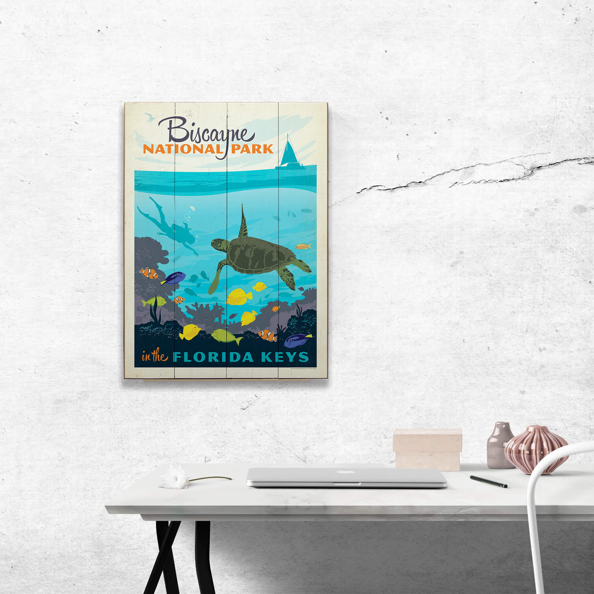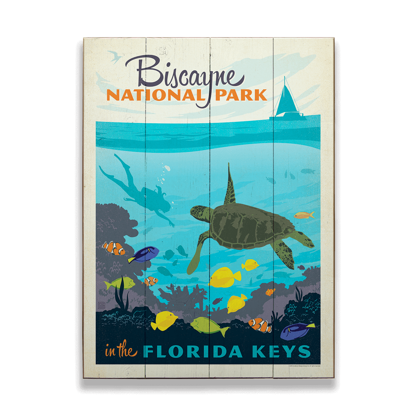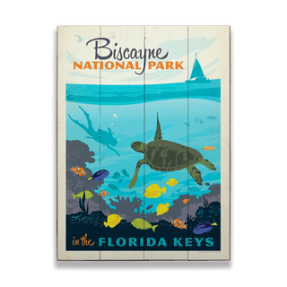 Explore the underwater marvels of Biscayne National Park through this vibrant poster, a tribute to the rich aquatic life of the Florida Keys. Showcasing a serene sea turtle swimming amongst colorful coral and fish, the artwork invites you to dive into the park's pristine waters. Above the surface, a sailboat glides along, capturing the tranquility and adventure that awaits in this natural paradise. Perfect for marine enthusiasts and conservationists alike, this piece brings the beauty of one of America’s most treasured national parks right into your home.