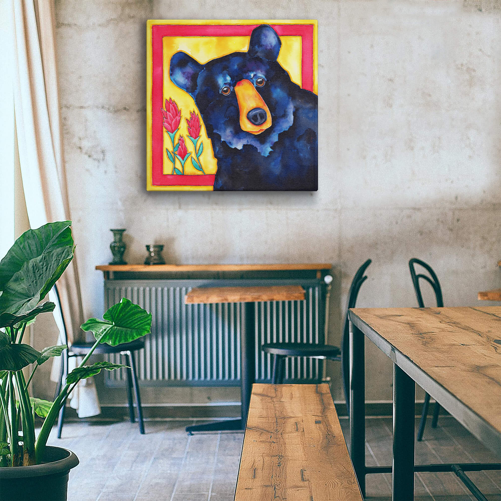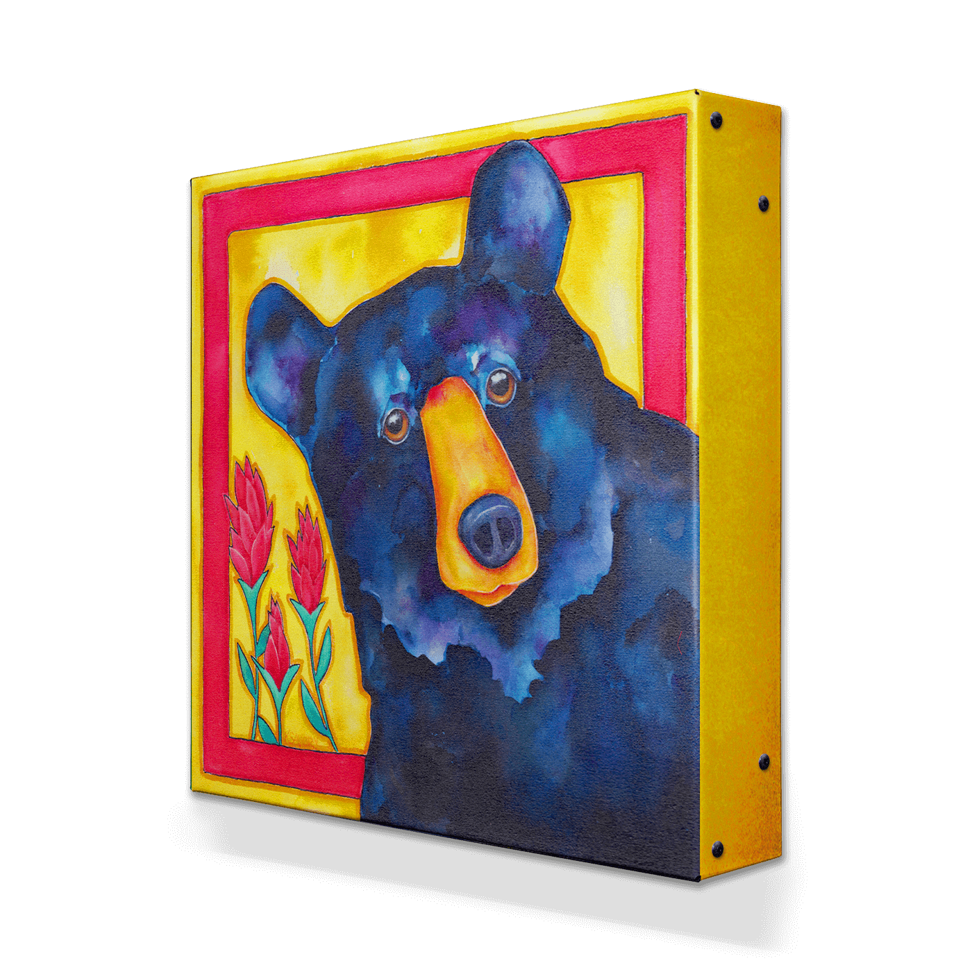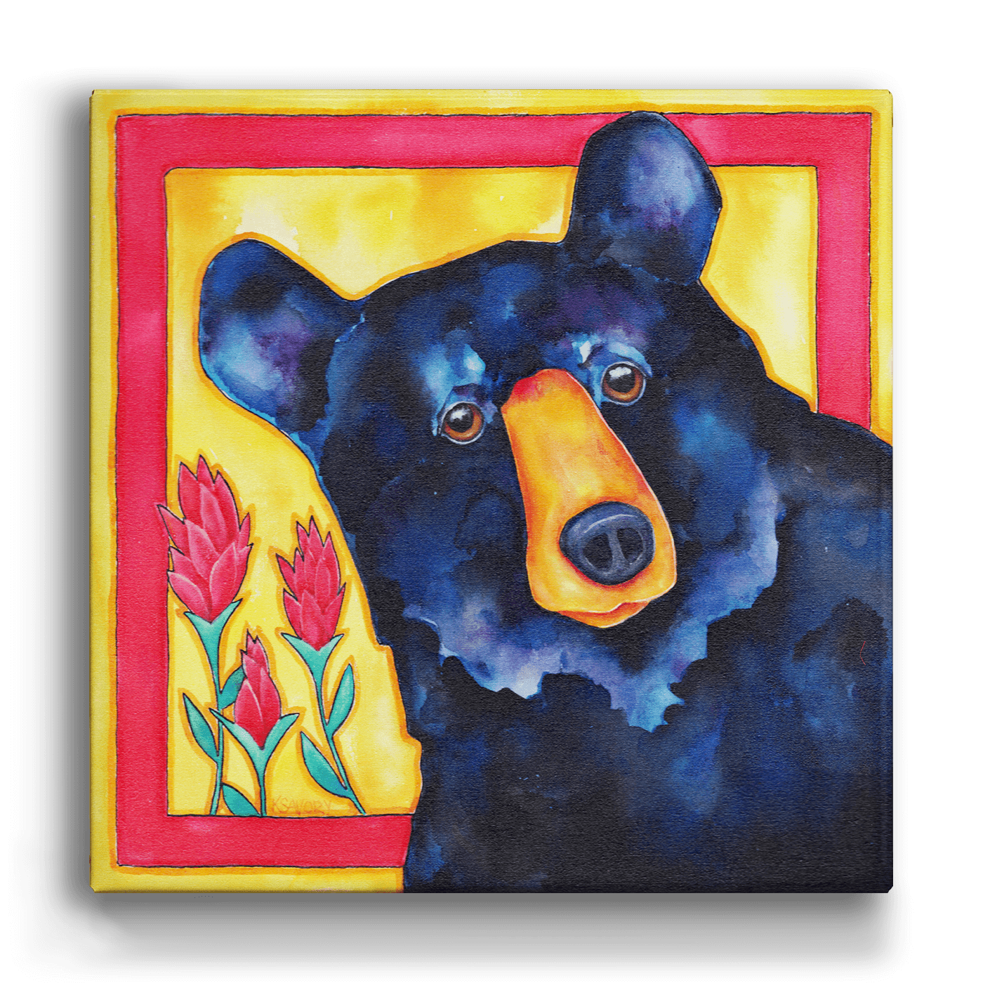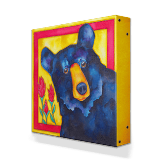 This charming artwork features a curious black bear set against a warm yellow and red border with floral accents. The bear’s playful expression and bold colors bring a touch of nature and whimsy to any space. Perfect for adding personality and warmth, this piece is ideal for wildlife enthusiasts and art lovers alike.