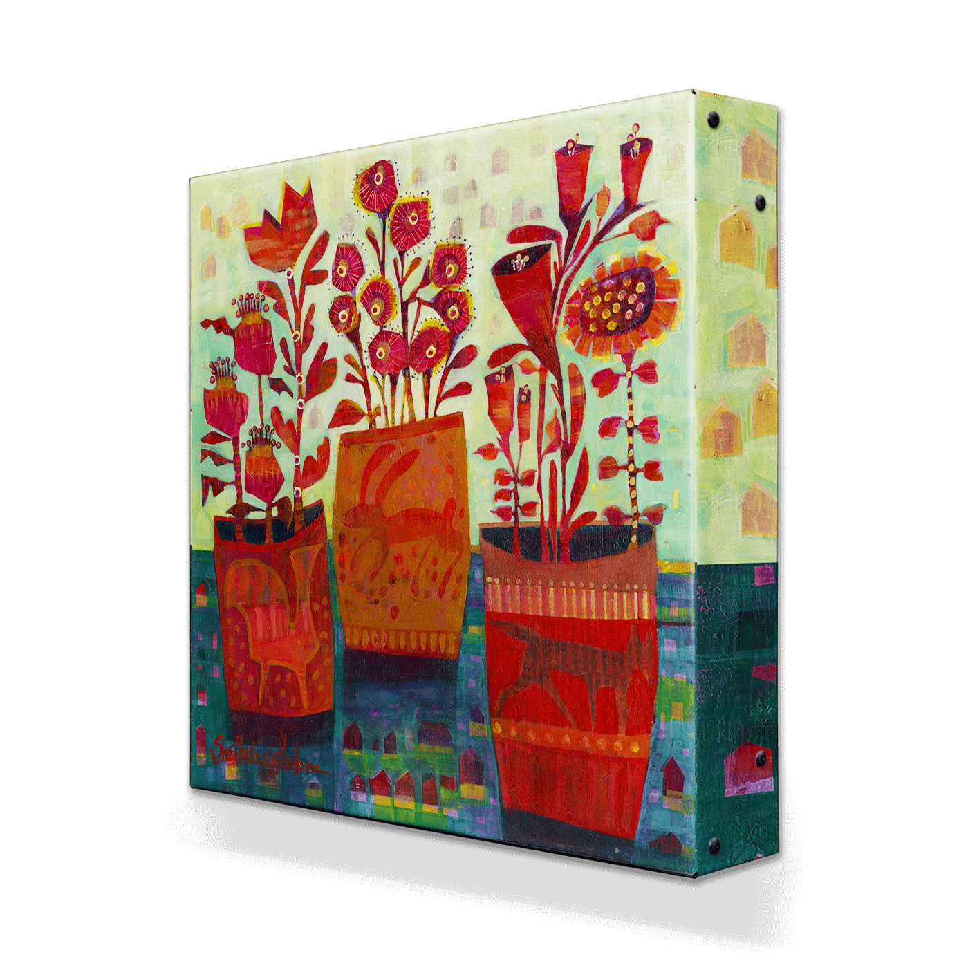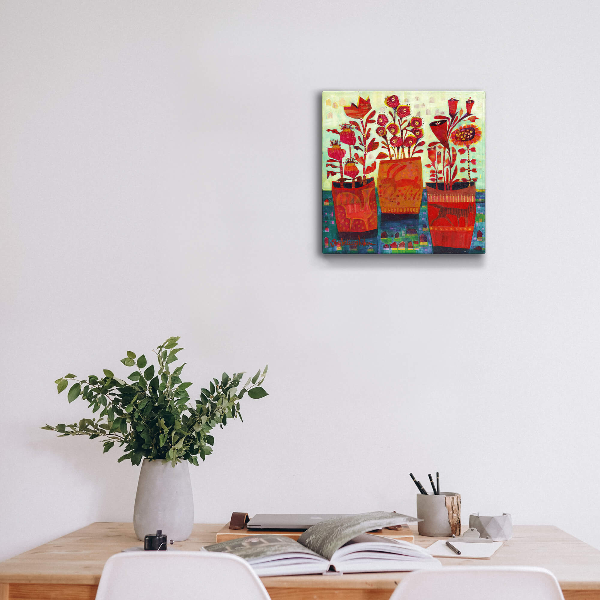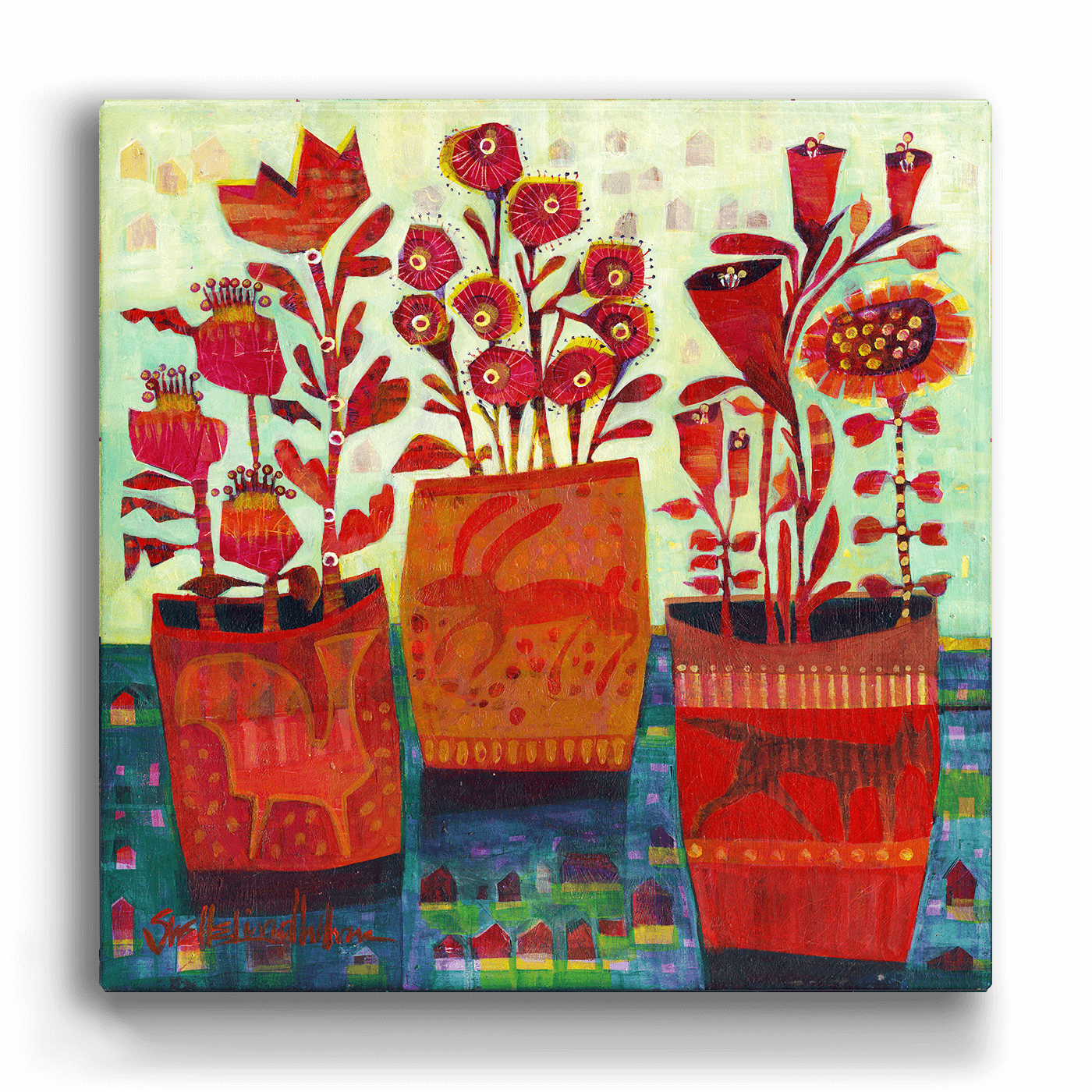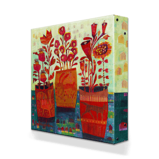 This vibrant and whimsical artwork showcases flourishing plants growing out of three intricately designed mugs, each adorned with subtle animal motifs. The bold reds and detailed patterns of the blooms and mugs contrast beautifully with the soft textures and cool colors of the background. With its lively color palette and imaginative design, this piece captures the essence of creativity and growth, making it an uplifting addition to any space.