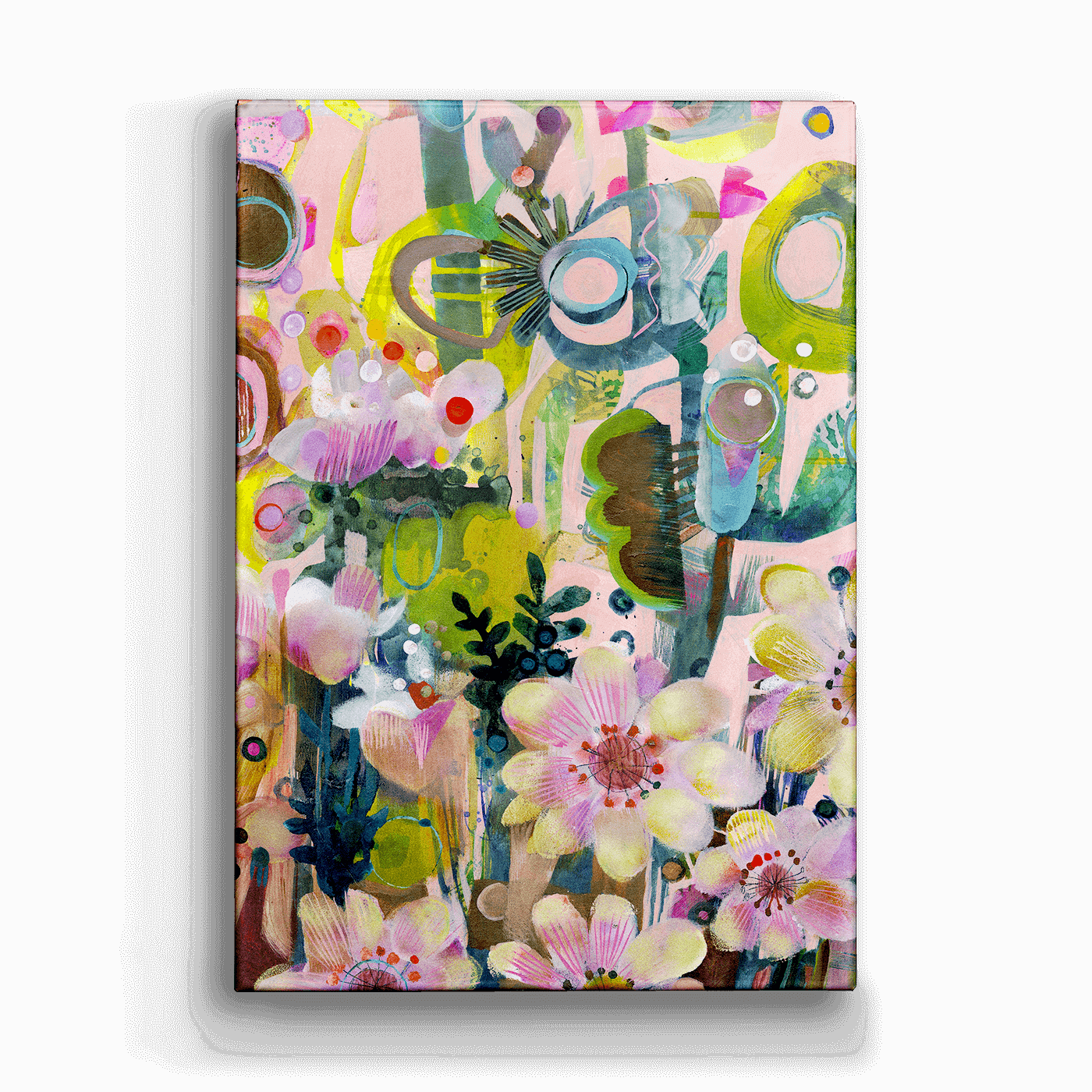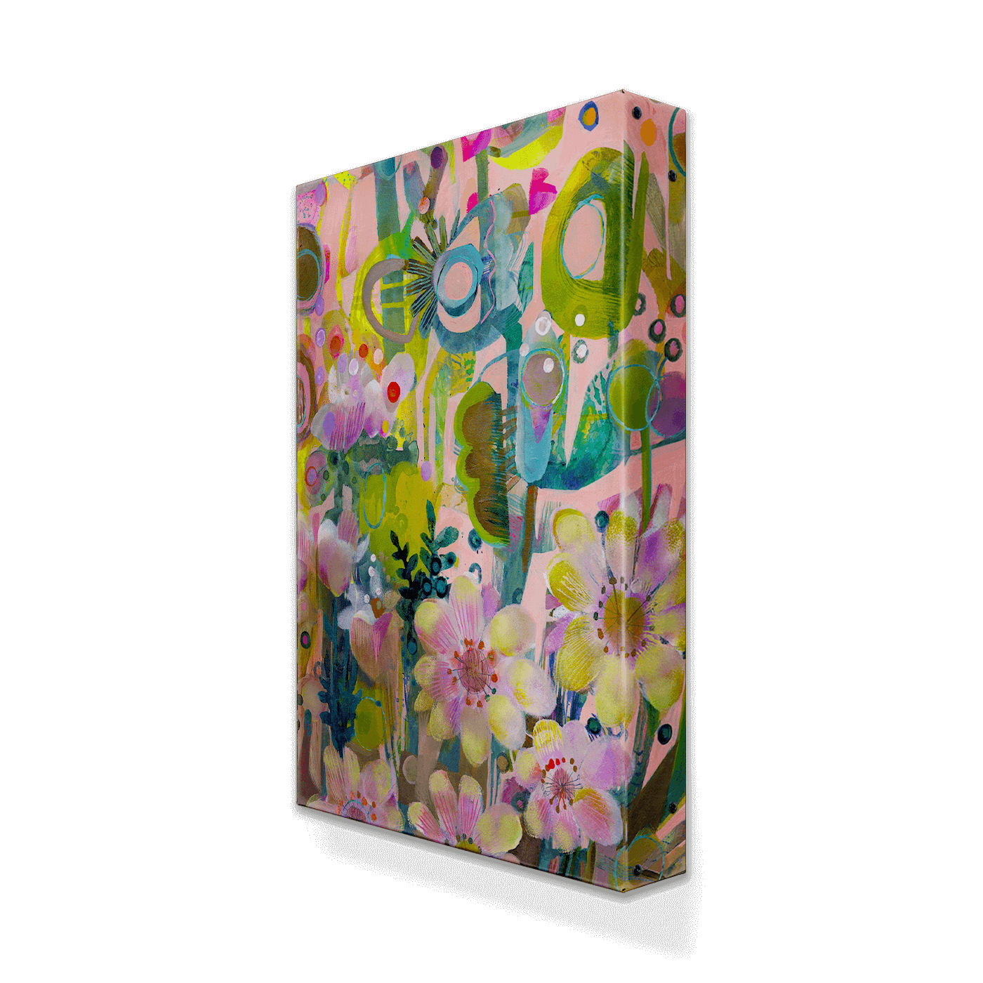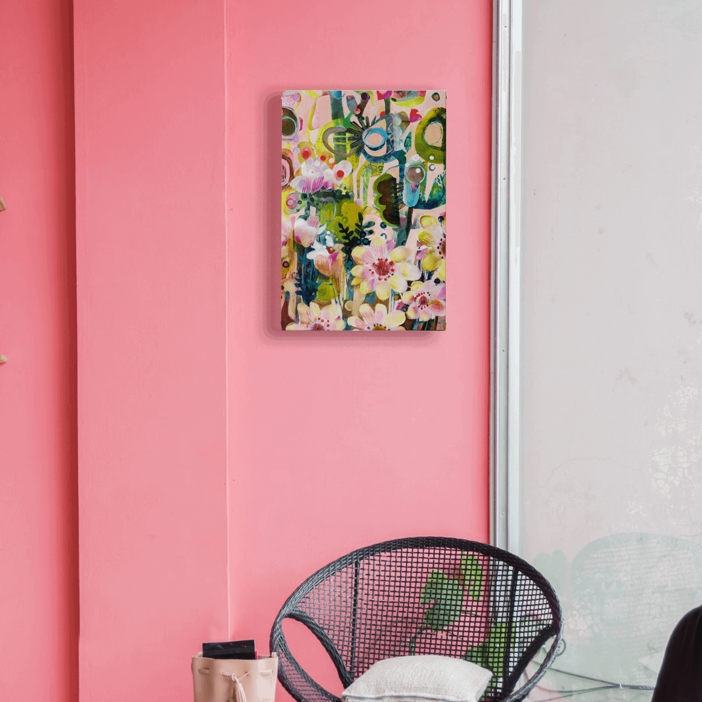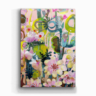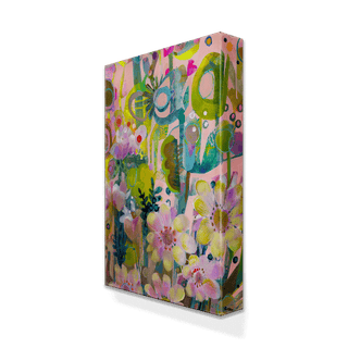 Step into the delightful charm of "Bloomsterdrom," a dynamic box-art piece by Esté MacLeod. This work is an exquisite example of her ability to blend reality with the figments of her imagination, presented on the innovative medium of aluminum shaped into a shallow box. The flowers seem to dance across the canvas, offering a multi-layered experience of color, pattern, and texture that whispers of secret gardens and mystical landscapes. This piece is a testament to Esté's signature style of fresh, whimsical artwork, where every brushstroke and color choice is a testament to her layered technique.
