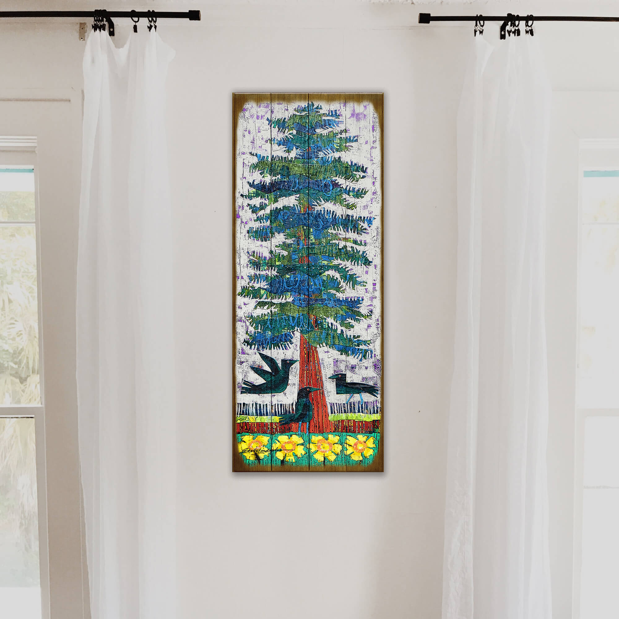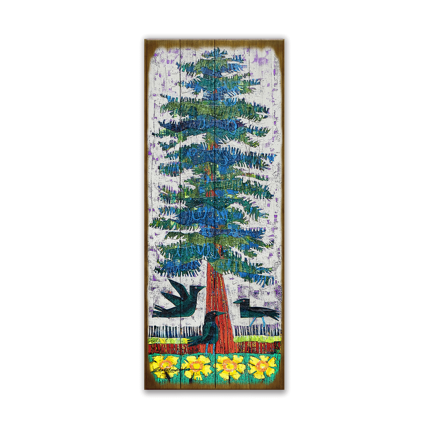 This vibrant artwork celebrates the majesty of the towering evergreen tree, surrounded by playful birds and a colorful carpet of bright yellow flowers. The intricate details of the foliage, paired with the lively movement of the birds, create a dynamic composition full of life and energy. With its bold use of color and whimsical style, this piece captures the essence of nature's beauty and interconnectedness, making it a striking addition to any space. Perfect for those who appreciate the charm of the outdoors and the artistry of the natural world.