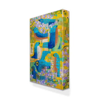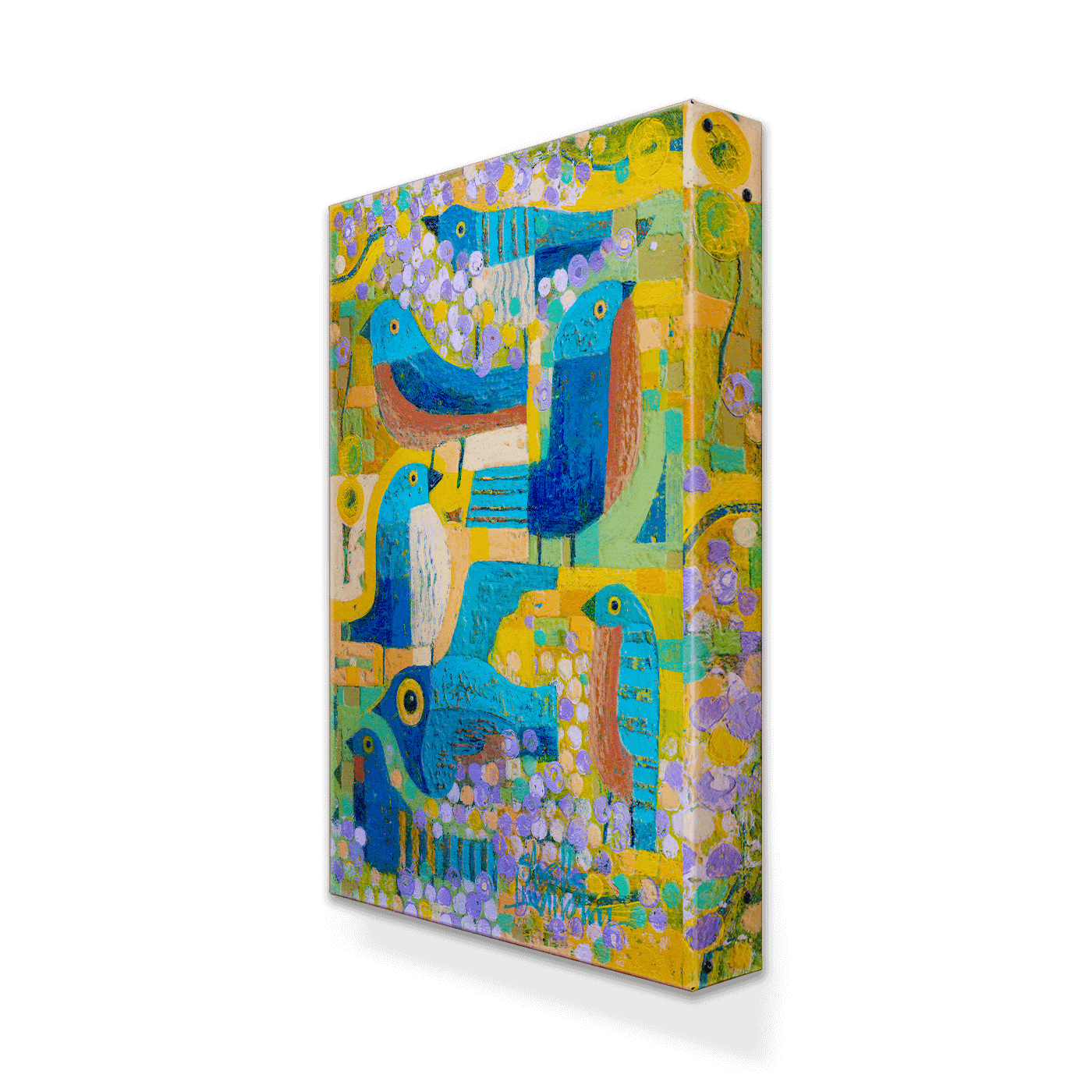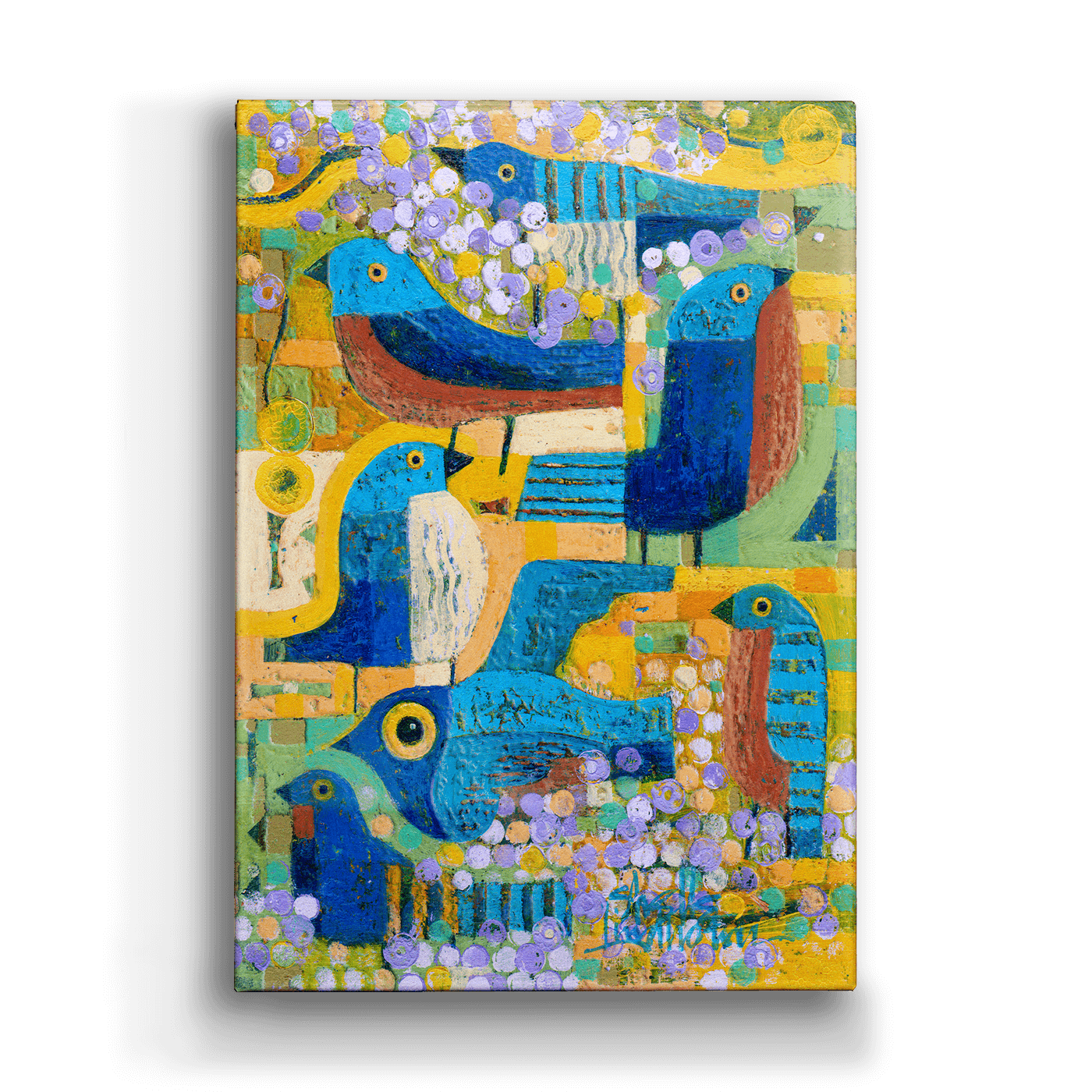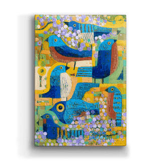 This vibrant and whimsical artwork features a delightful collection of abstract birds in rich blues and warm earthy tones. Accented with lilacs and a golden and green patchwork background, the piece creates a harmonious and lively composition. The layered textures and geometric patterns add depth, while the playful arrangement of the birds evokes a sense of community and joy. Perfect for bird enthusiasts and art lovers, this artwork is an uplifting celebration of color and creativity.