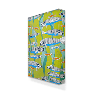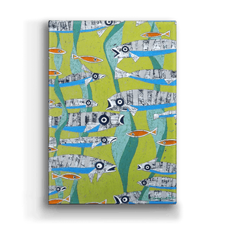 Bring a bold and unique statement to your home or office with this artwork, featuring a school of stylized fish swimming against a vibrant lime green and teal backdrop. The intricate details of the black and white fish, interspersed with small orange accent fish, create a dynamic and whimsical composition that celebrates underwater life. Perfect for fishing enthusiasts or lovers of nature-inspired art, this piece adds a splash of color and movement to any space.