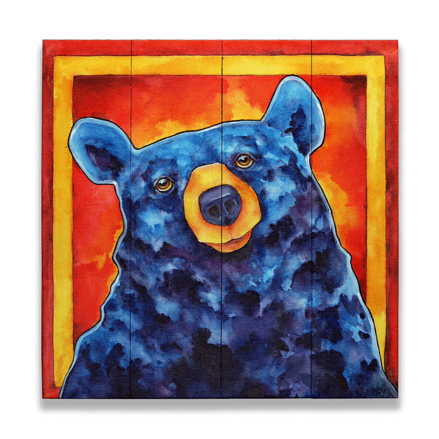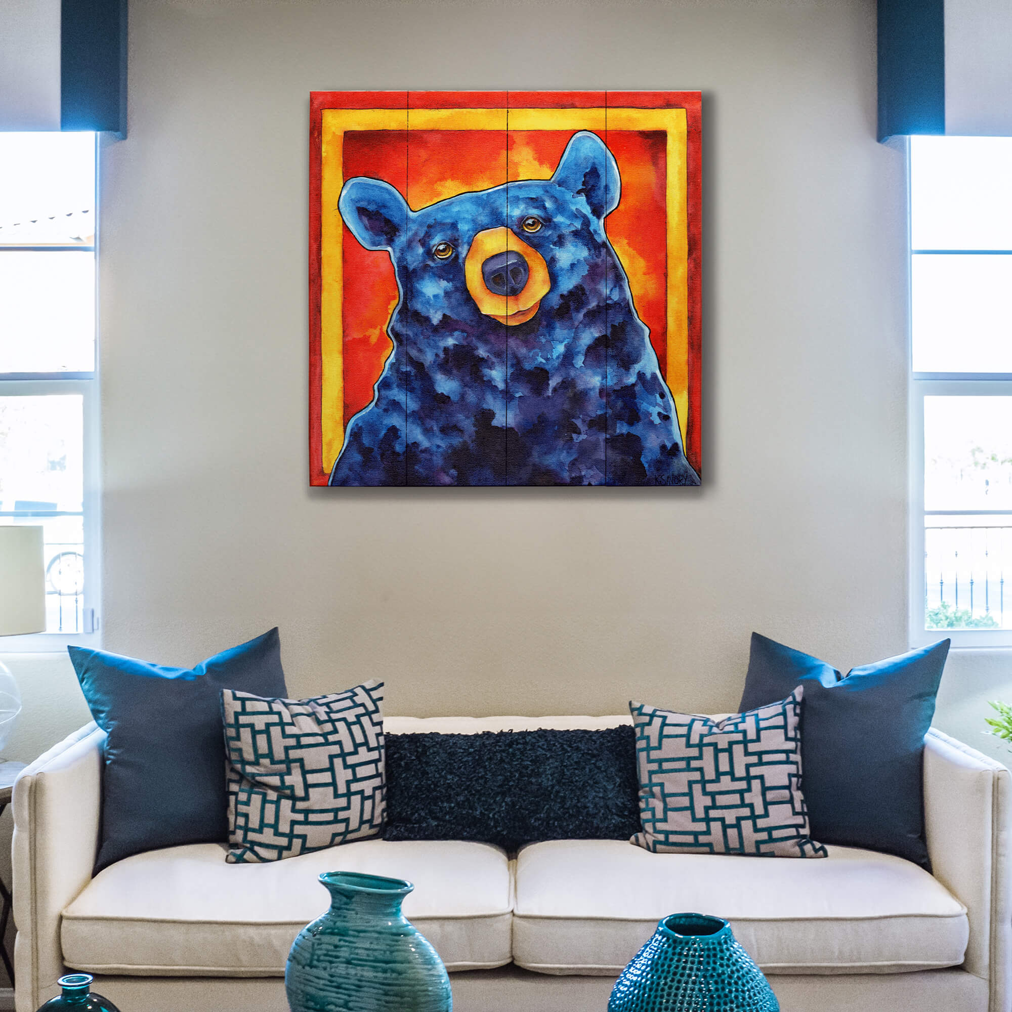 "Bound by Wild Desire" offers a whimsical and vibrant depiction of a blue bear set against a fiery red and orange backdrop, capturing a playful and imaginative essence. This artwork brilliantly uses bold colors and a stylized form to create a sense of fun and wonder. Ideal for those who appreciate art that brings a creative twist to familiar subjects, this piece adds a whimsical charm to any room, making it a perfect choice for brightening spaces with a touch of artistic joy and colorful fantasy.