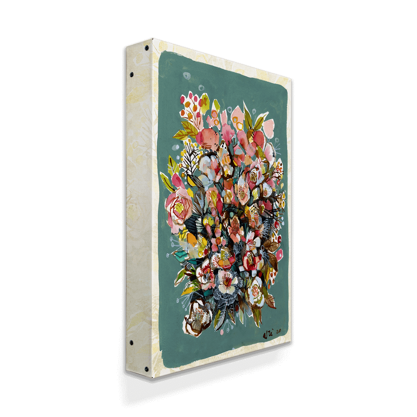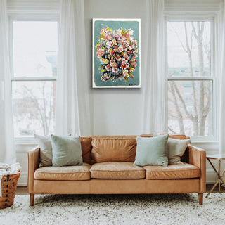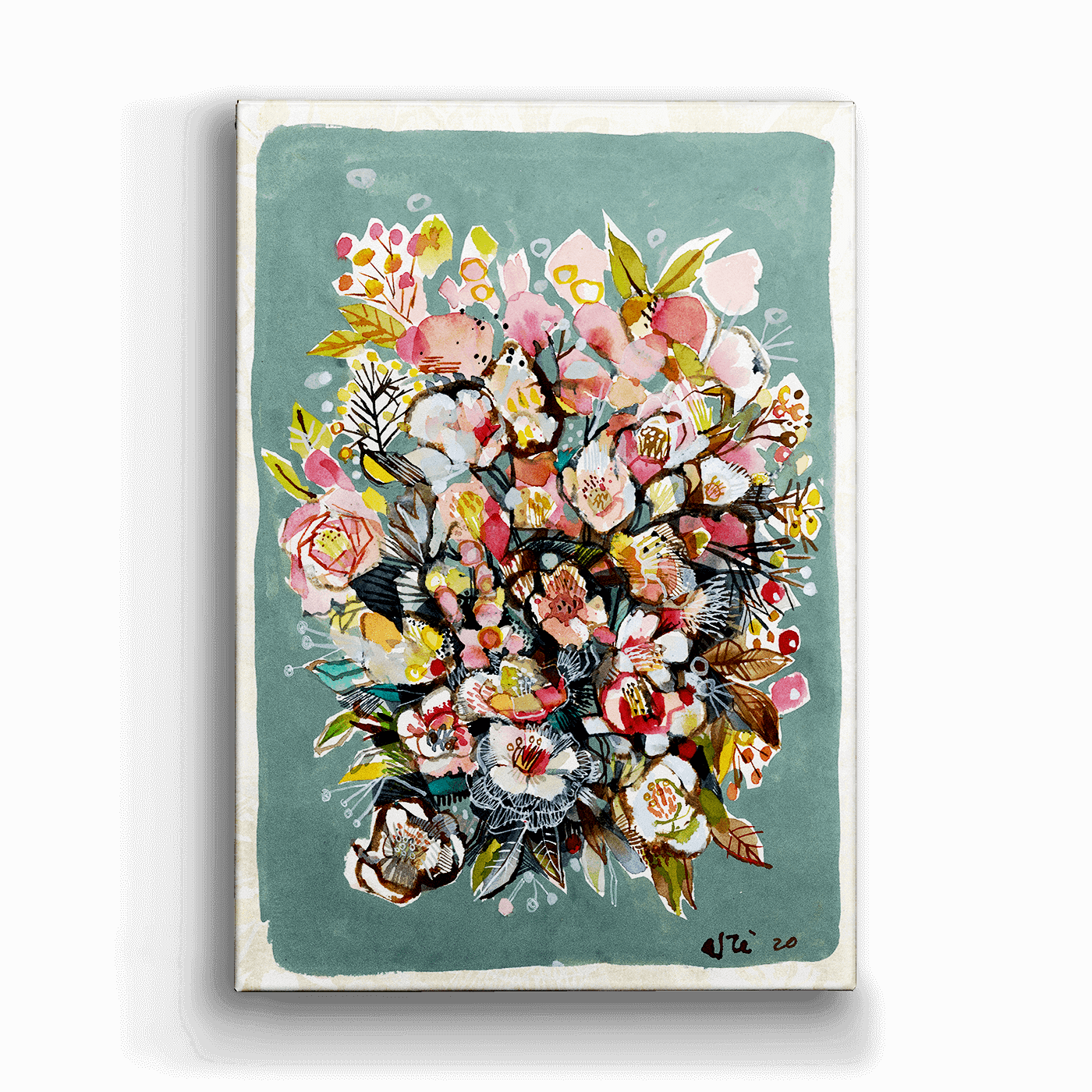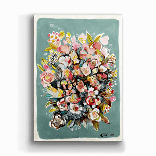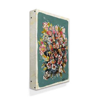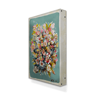 "Bouquet," a charming work by Esté MacLeod, exudes a sense of timeless romance through its modern box-art medium. The elegance of a classic floral arrangement is reimagined in this piece, where the print on aluminum provides a durable canvas for the lush, whimsical brushstrokes. Esté's expertise in textile and ceramic design shines through in the opulent display of flowers, rendered in a symphony of stylized shapes and an effusion of colors.