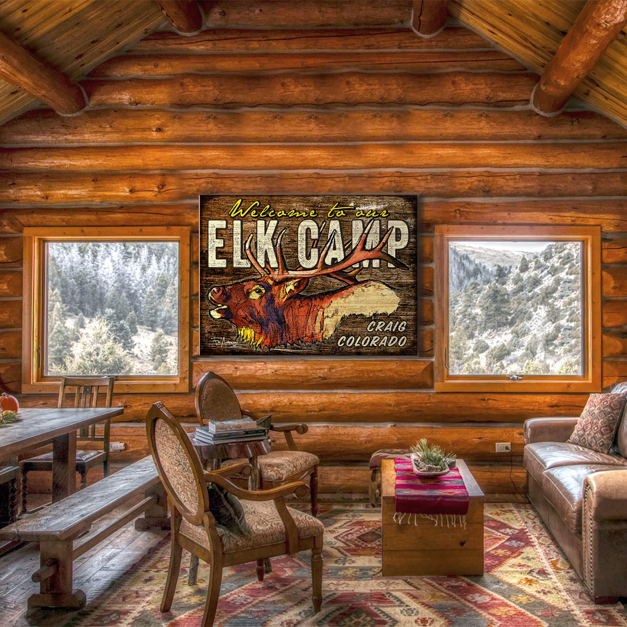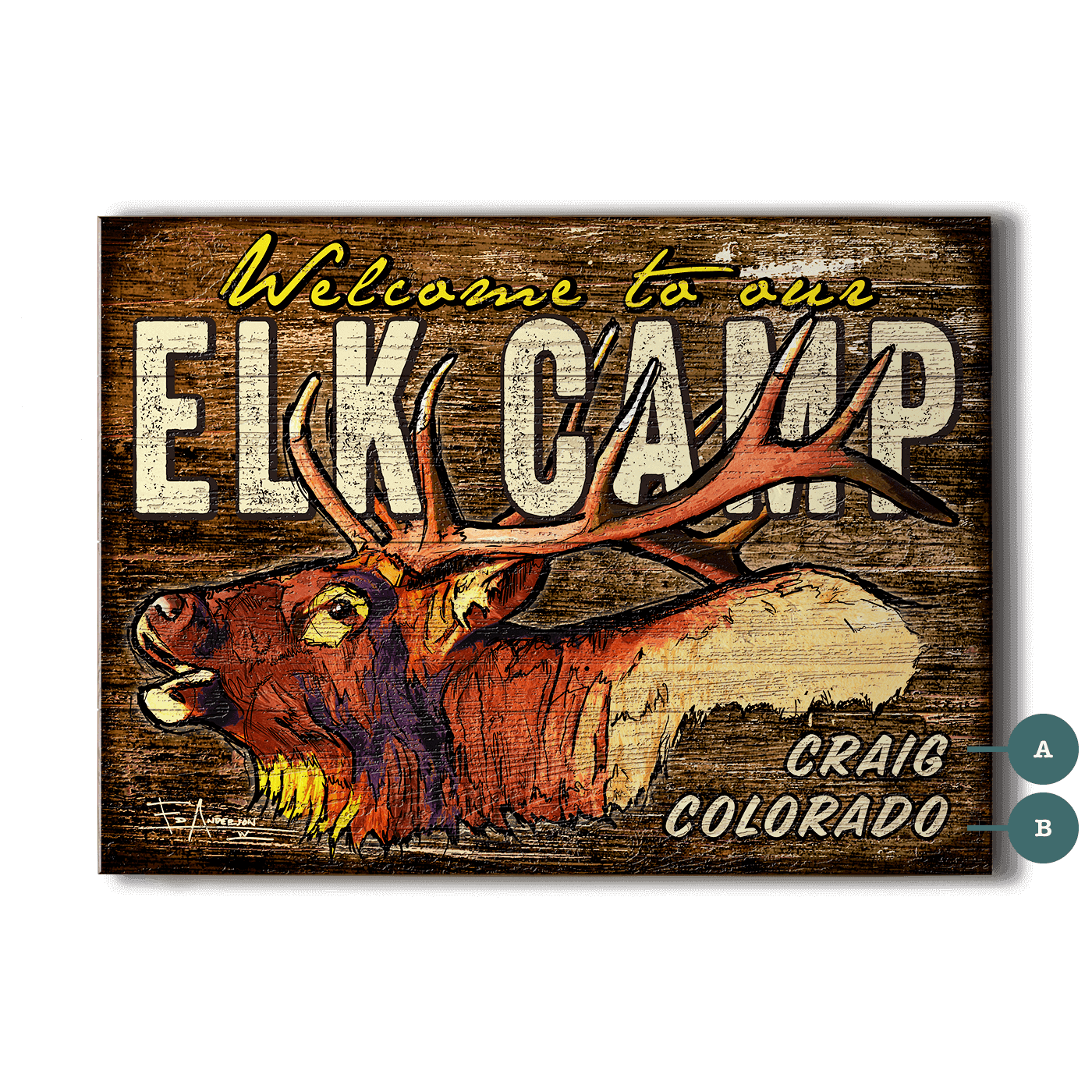 Step into the rustic warmth of the great outdoors with this personalized artwork. It captures the majestic beauty of the elk, set against the timeless backdrop of a wooden canvas, evoking the authenticity of a Colorado campsite or your local retreat. This piece is customizable, allowing you to celebrate the location that speaks to your heart and the spirit of wilderness adventures. Ideal for hanging in your cabin, lodge, or any space that cherishes the call of the wild, it's a fitting tribute to nature's grandeur and the memories made in the mountains.