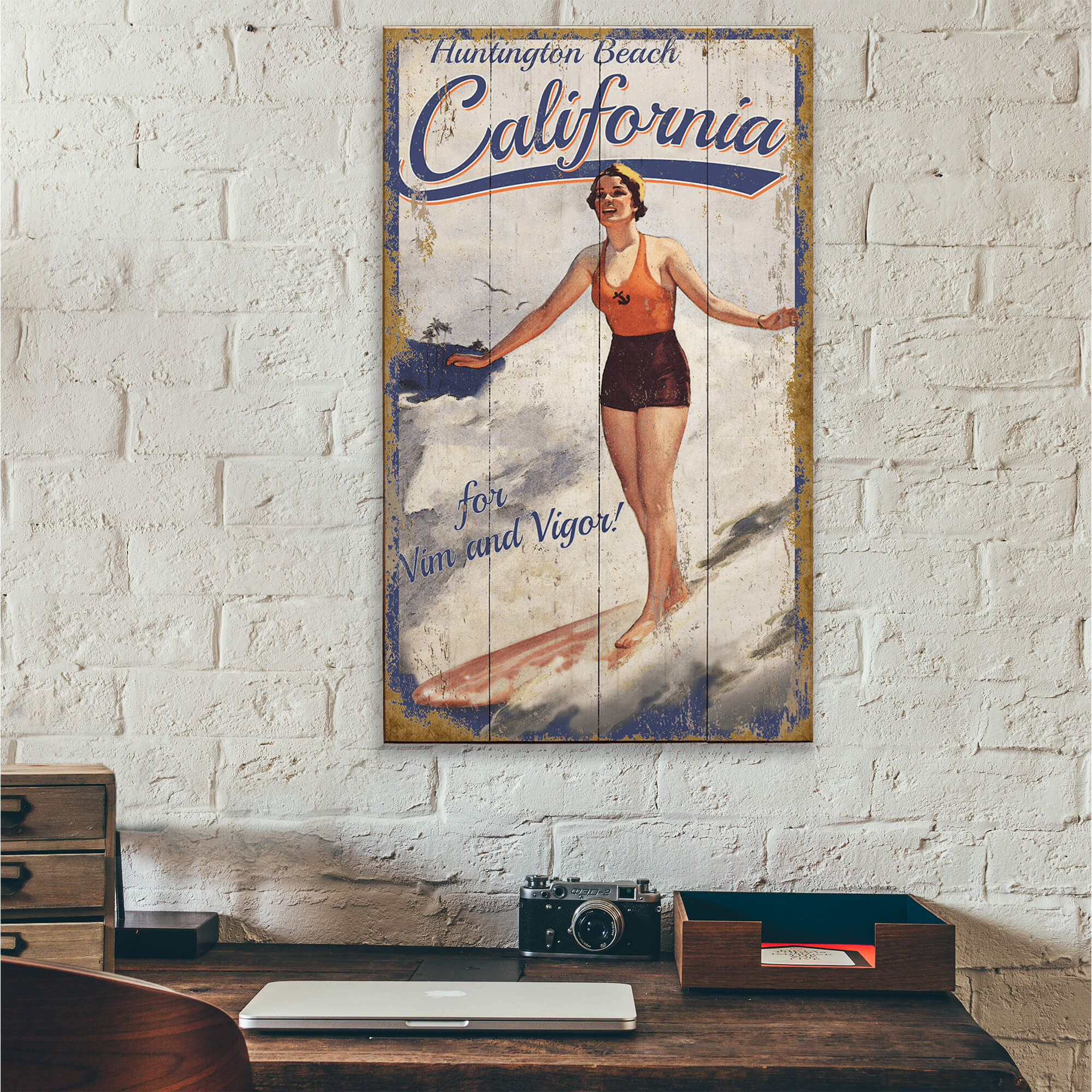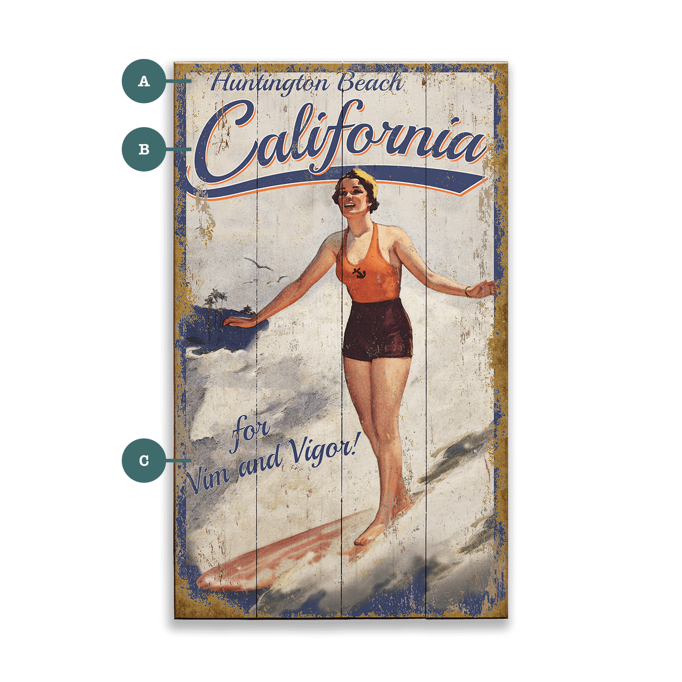 This vintage-inspired surf artwork features a cheerful surfer riding a wave, capturing the carefree spirit of sunny days by the sea. With retro typography and a weathered finish, it brings a nostalgic touch to any beach-themed room, surf shop, or coastal décor. Ideal for adding a splash of surf culture to your space, this piece can be personalized for a unique, custom look.