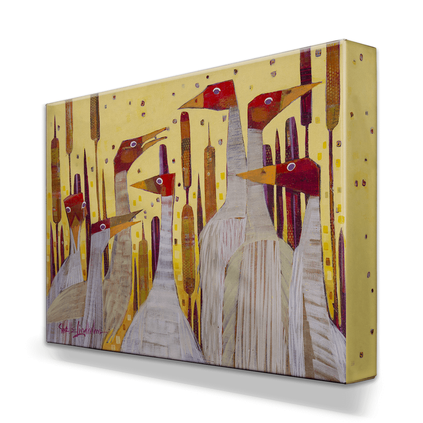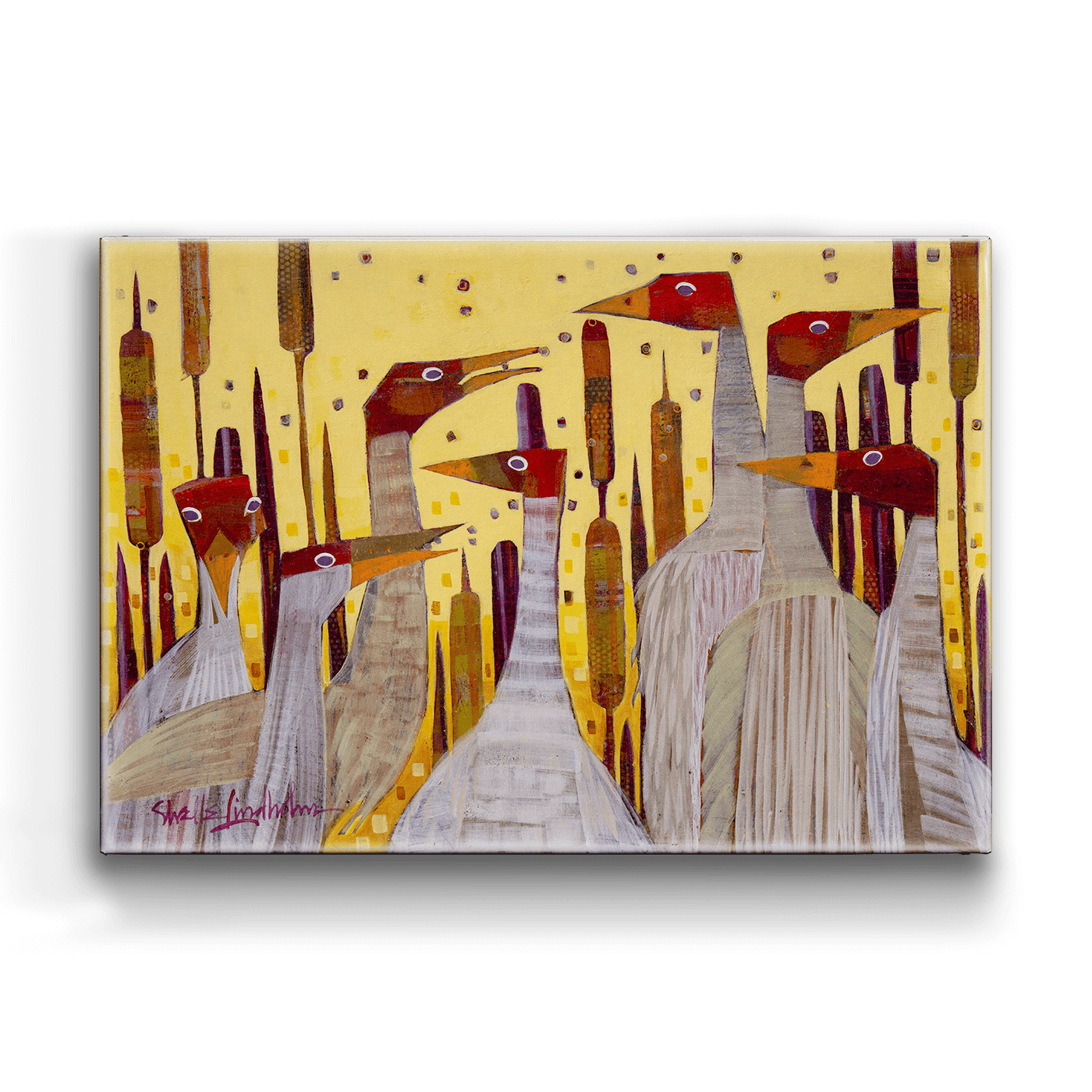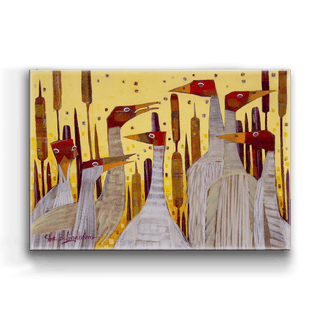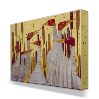 Enhance your space with this stunning artwork, featuring a gathering of elegant cranes amidst tall reeds on a warm yellow backdrop. The intricate textures and earthy tones bring a sense of calm and natural beauty to any room. Perfect for nature lovers and art enthusiasts, this piece adds a unique and inviting focal point to your decor.